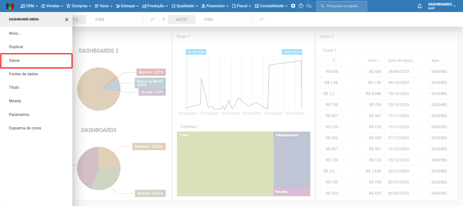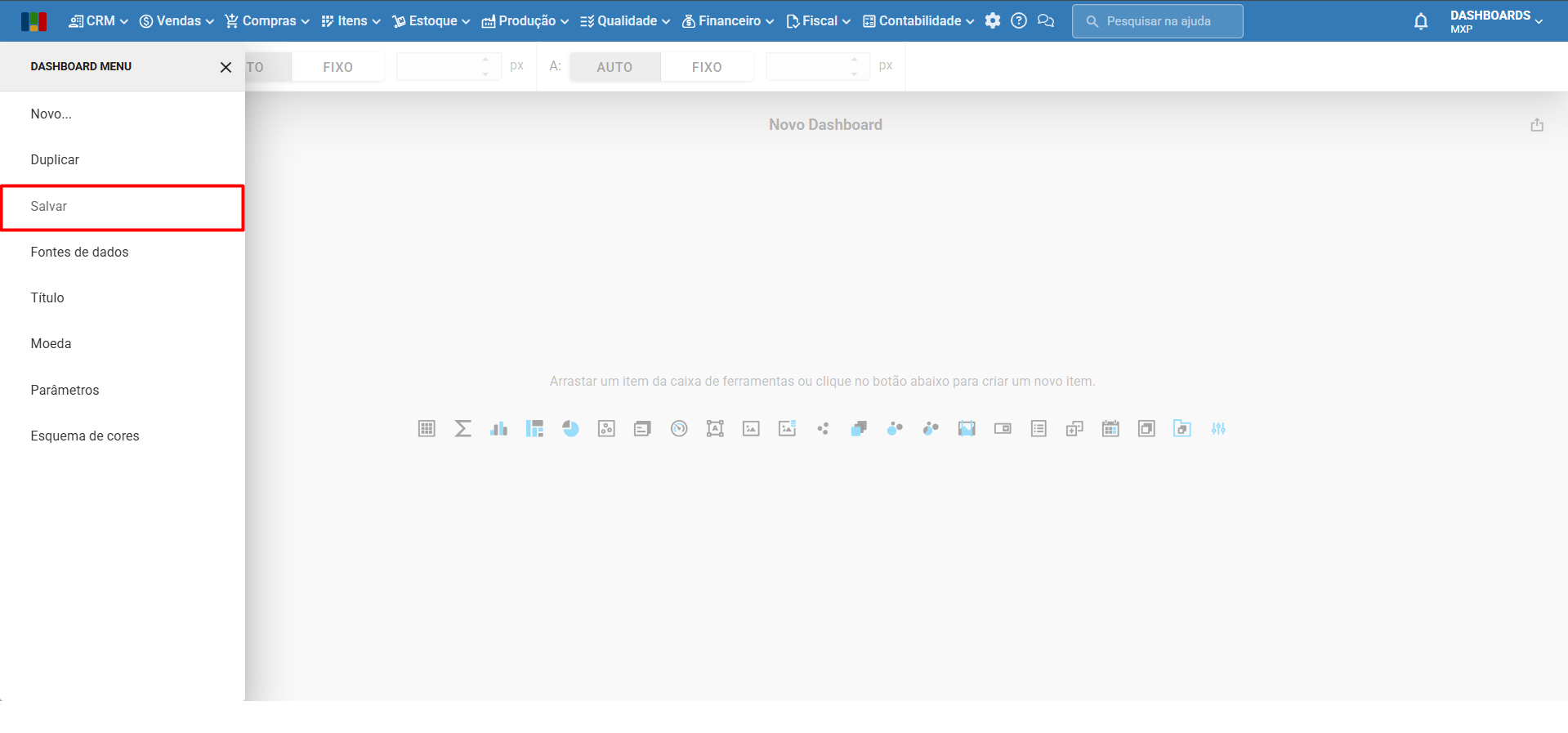 6) Clicando em “Salvar”, quaisquer mudanças realizadas neste dashboard serão salvas. Esse menu só é habilitado quando alguma alteração é feita.