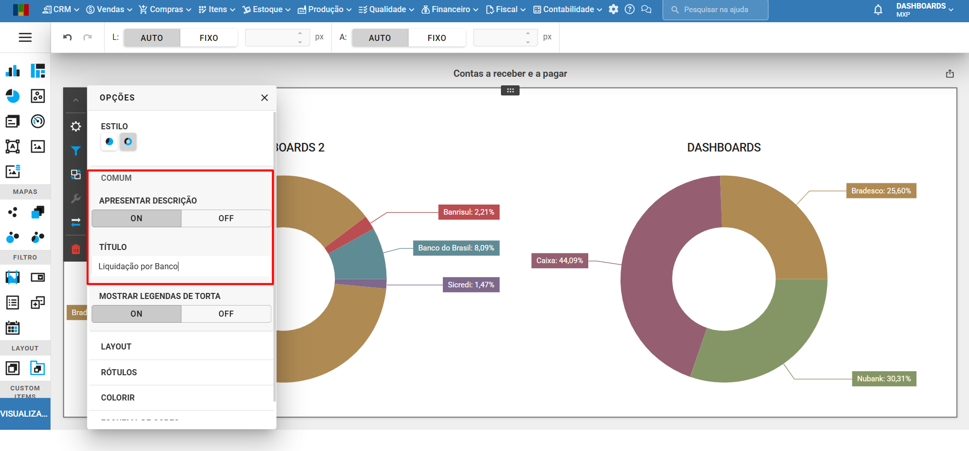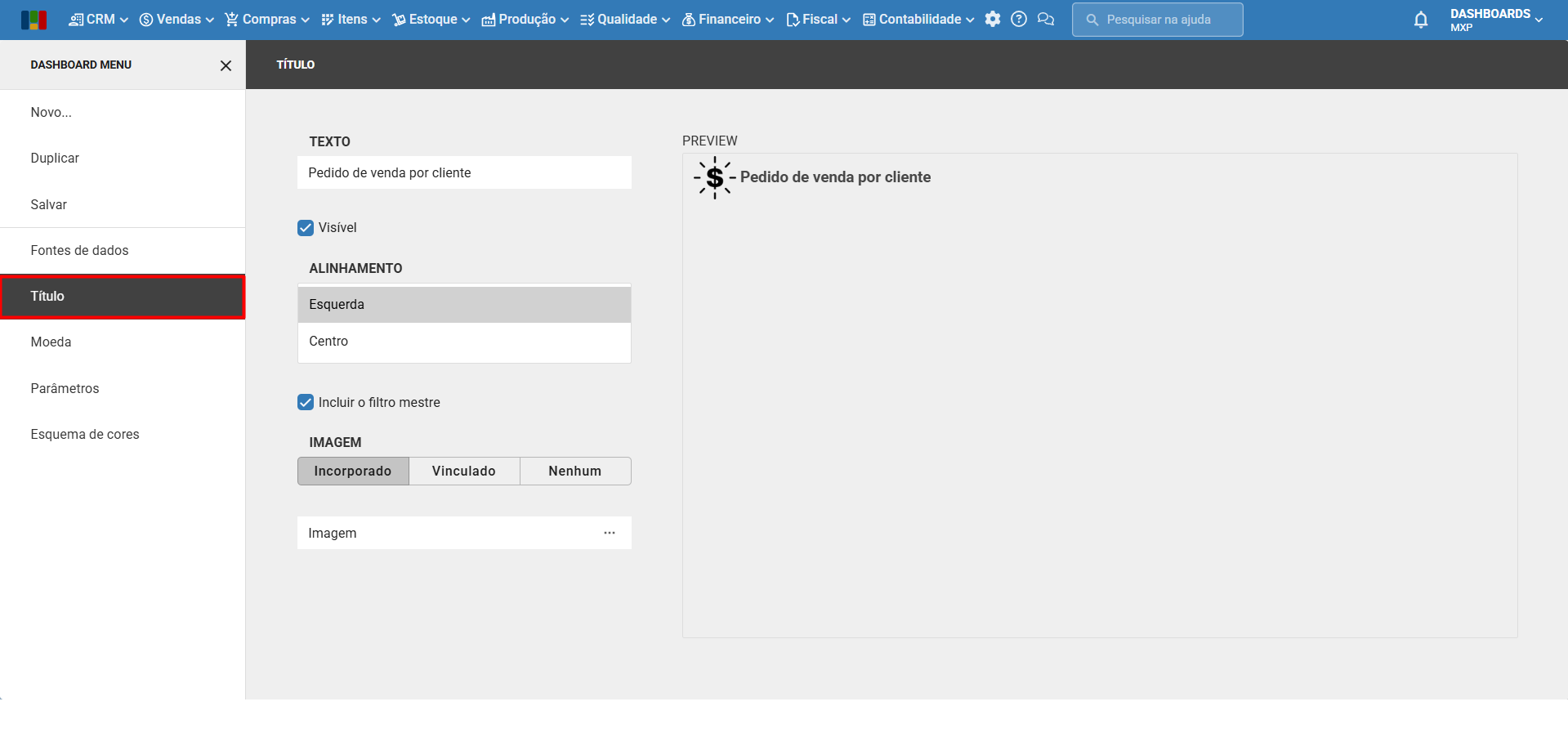- Mostrar Título: para PDFs, é possível ocultar o título do dashboard. Se marcado, era habilitar o campo comum “Título”.