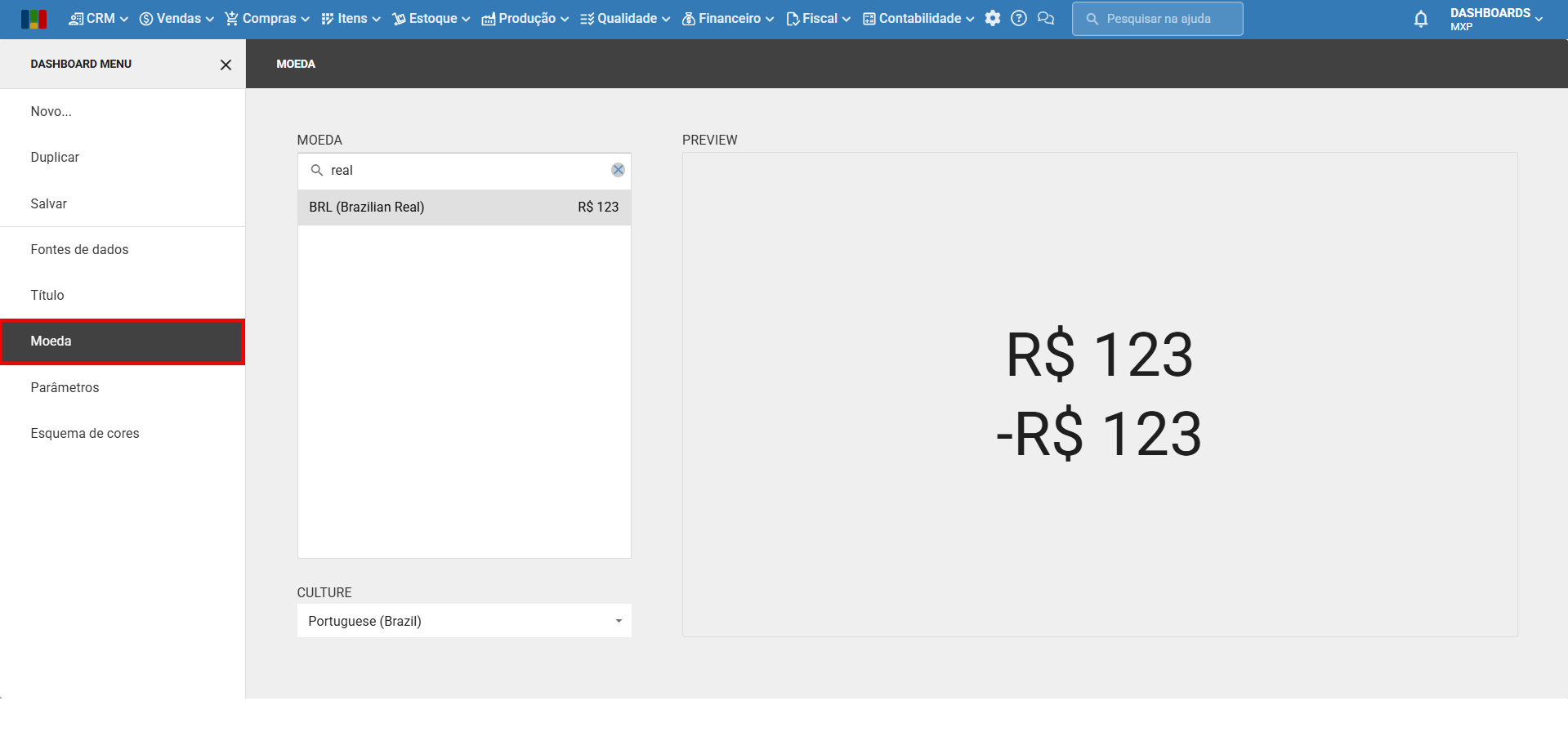9) Em “Moeda”, poderá configurar a moeda que deve ser utilizada no dashboard. Para isso, pesquise a moeda pela “barra de pesquisa”, a selecione e depois clique em “Salvar”, no menu lateral.