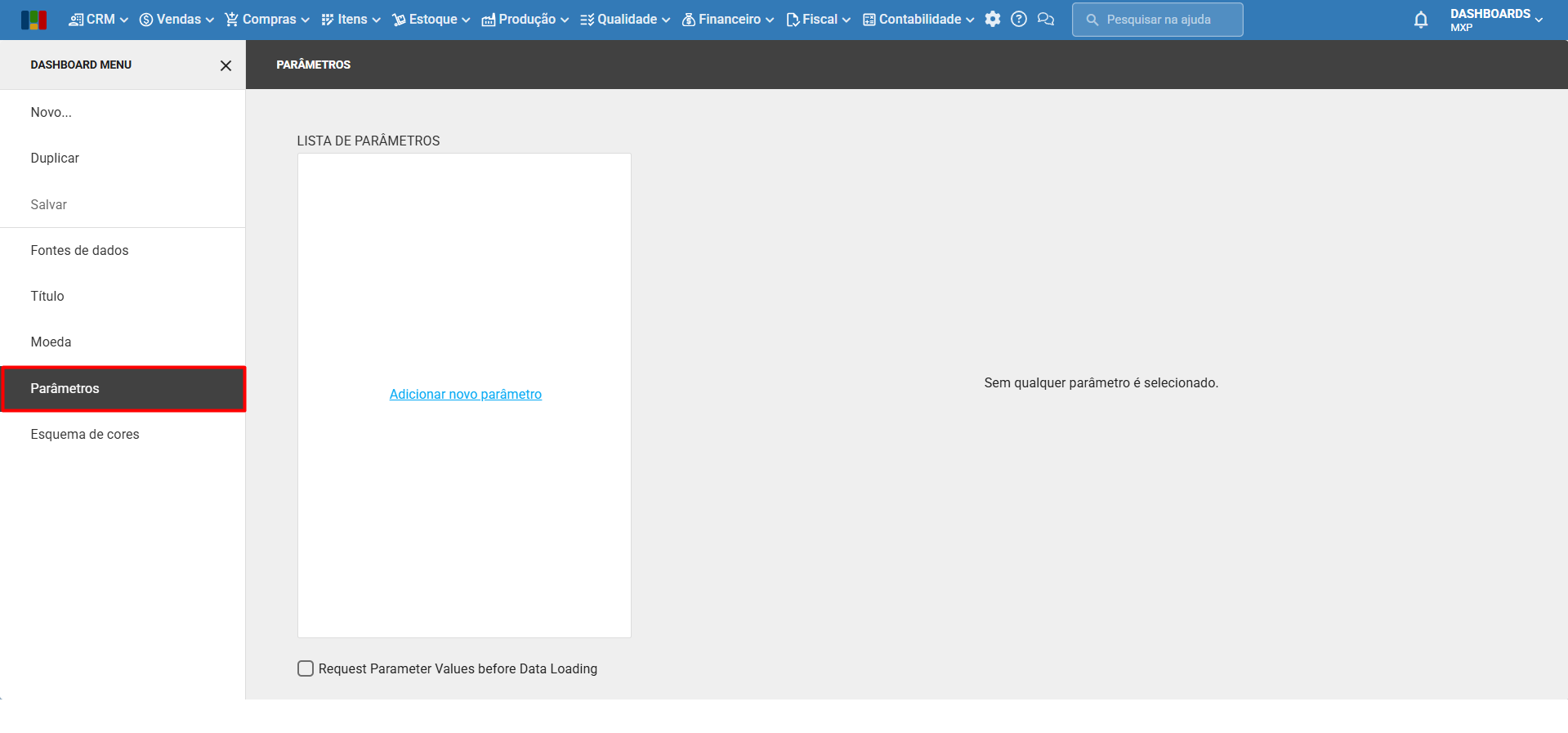 10) Em “Parâmetros”, poderá cadastrar parâmetros que permitem o uso de cálculos e expressões lógicas na filtragem de dashboards. Para saber mais sobre parâmetros, clique aqui.
