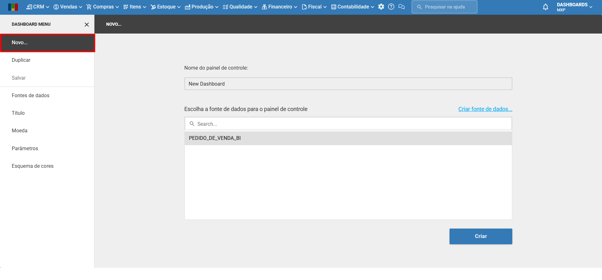 4) Clicando em “Novo”, poderá cadastrar um novo dashboard, à parte do que está acessando no momento. Informe o título que deseja e uma fonte de dados anteriormente cadastrada. Para finalizar, clique no botão azul “Criar”. Para saber mais sobre fonte de dados, clique aqui.
