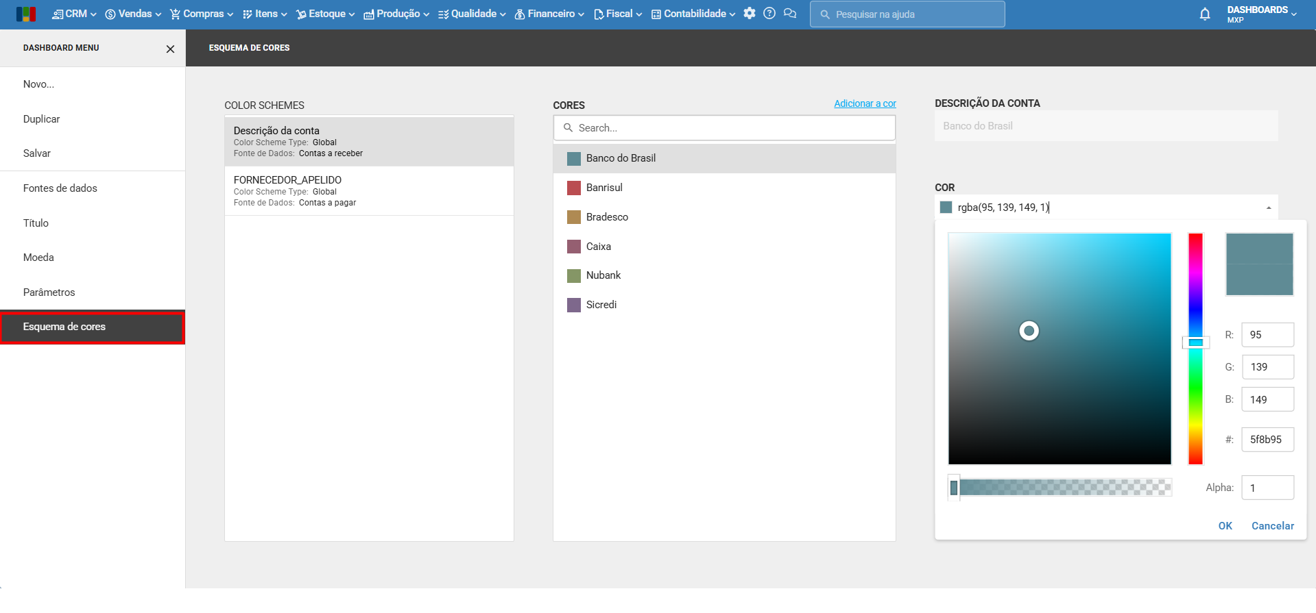11) No “Esquema de cores”, poderá personalizar as cores usadas em gráficos. Quando incluir um gráfico no dashboard que permite essa configuração, ele ficará presente na listagem “COLOR SCHEMES”.