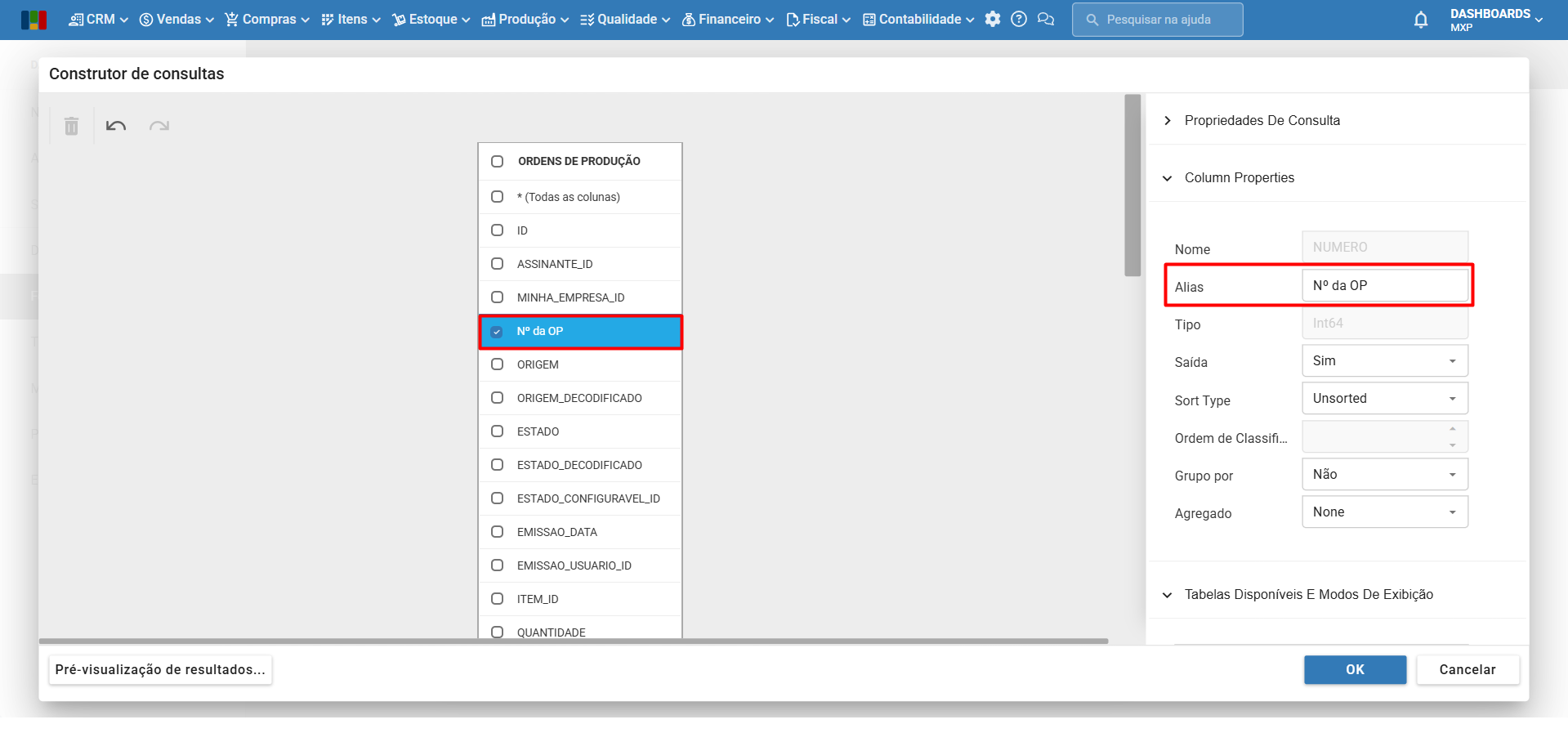 - Alias: habilitado somente se a coluna estiver com sua caixa de seleção marcada, utiliza o mesmo funcionamento das tabelas: se informado, irá mudar o título exibido da coluna, quando editar dashboards.