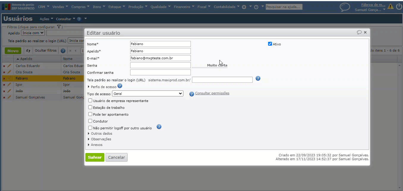 2) A seguir, acesse os cadastros de usuários através do menu superior “Roda dentada > Usuários”. Para editar as permissões de um usuário, expanda a seção “Perfis de acesso” e faça a inclusão e remoção dos perfis de acesso. Para saber mais sobre o cadastro de usuários, clique aqui.