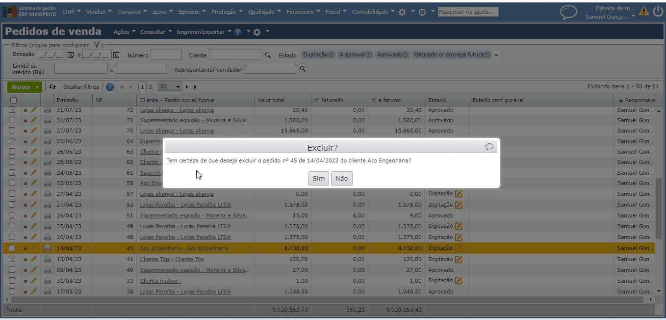 a) Por exemplo, ao tentar excluir um pedido de venda em estado de “Digitação”, o sistema retorna a mensagem: “Tem certeza de que deseja excluir o pedido nº {nº do pedido} de {data de emissão do pedido} do cliente {cliente do pedido}?”.