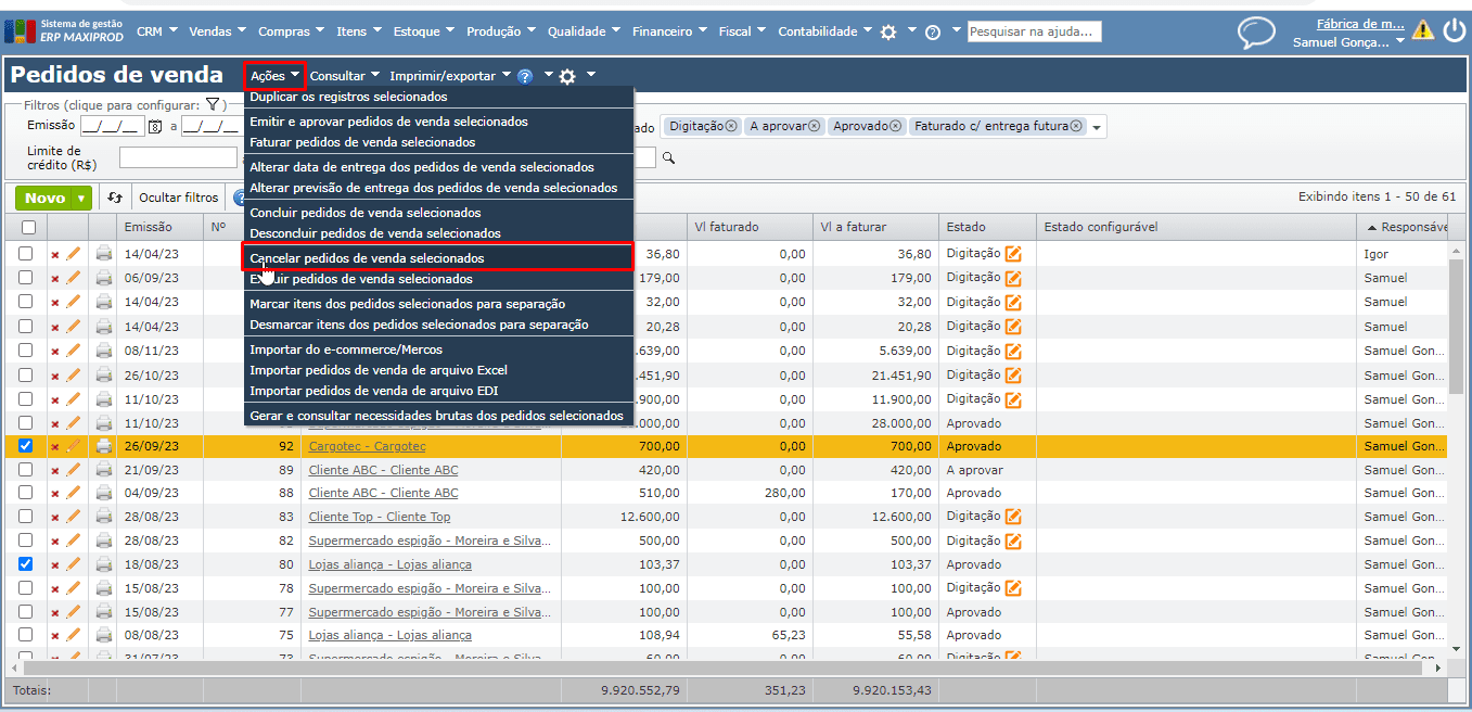 2) No caso de um documento de venda ou compra, selecione o registro e procure o submenu “Ações” na tela. A seguir, utilize a opção “Cancelar os registros selecionados”. O sistema fará as verificações necessárias para saber se é possível cancelar aquele documento e, se tudo estiver certo, efetivará o cancelamento.