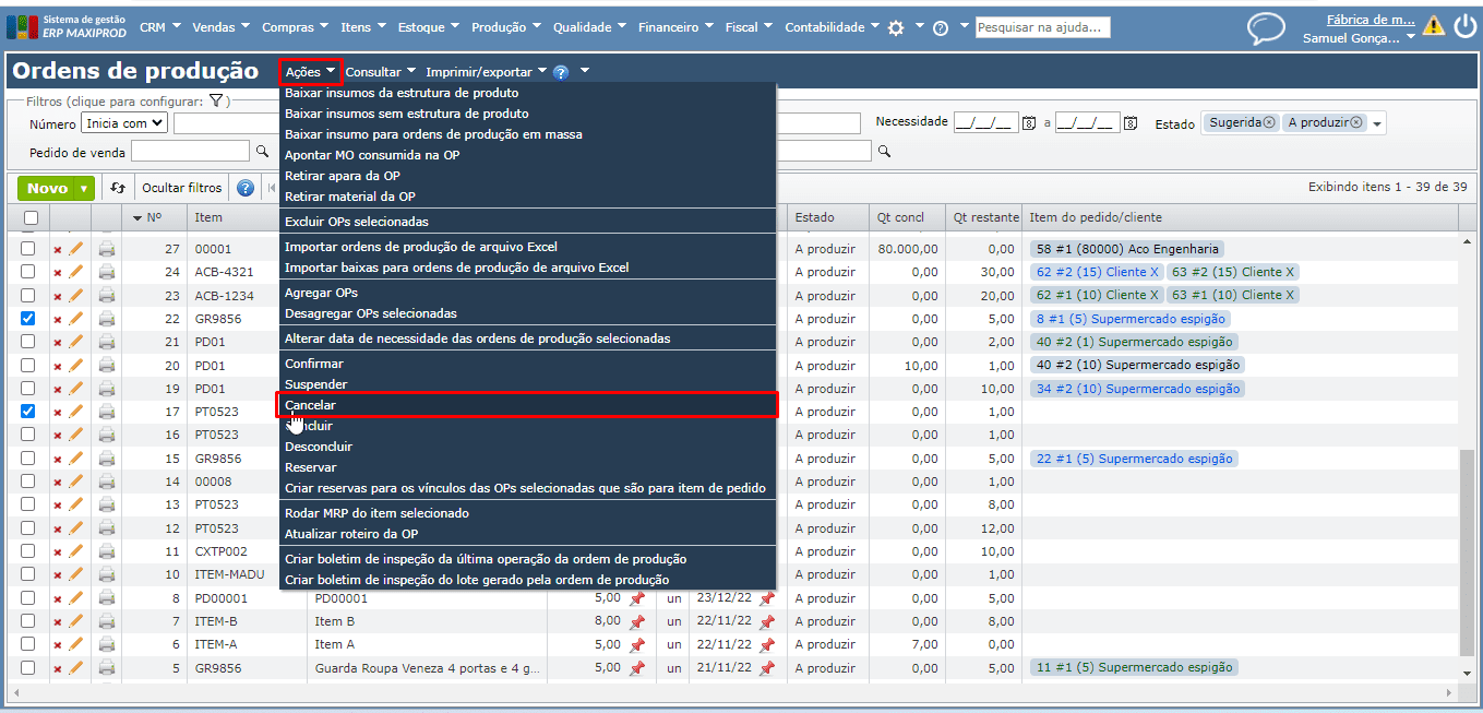 c) Para cancelar ordens de produção, acesse o menu superior “Produção > Ordens de produção”, selecione as OPs que deseja cancelar e clique no submenu “Ações > Cancelar”.