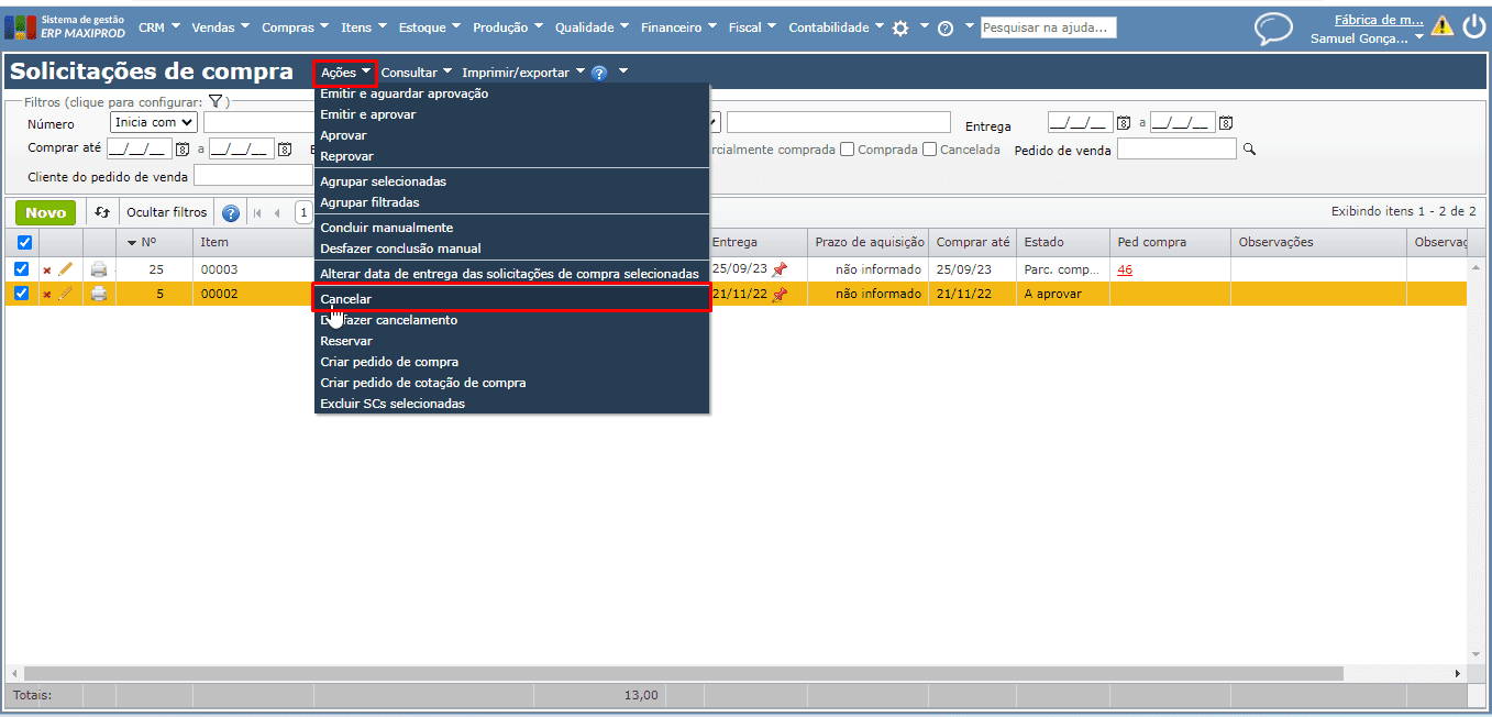 d) Para cancelar solicitações de compra, acesse o menu superior “Compras > Solicitações de compra”, selecione as SCs que deseja cancelar e clique no submenu “Ações > Cancelar”.