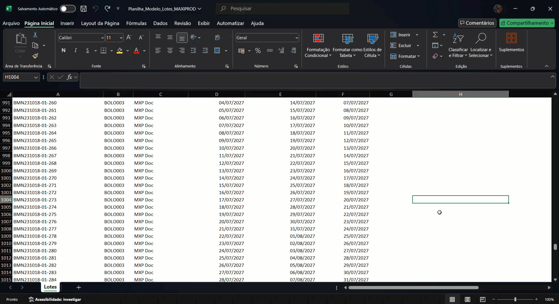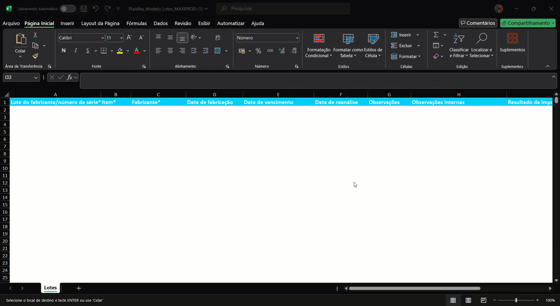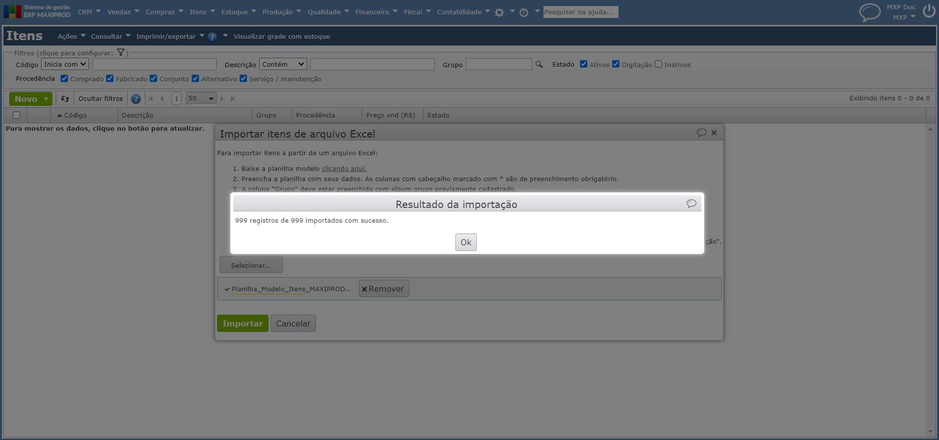 Atualmente, o ERP MAXIPROD só importa planilhas Excel com até 1000 linhas.