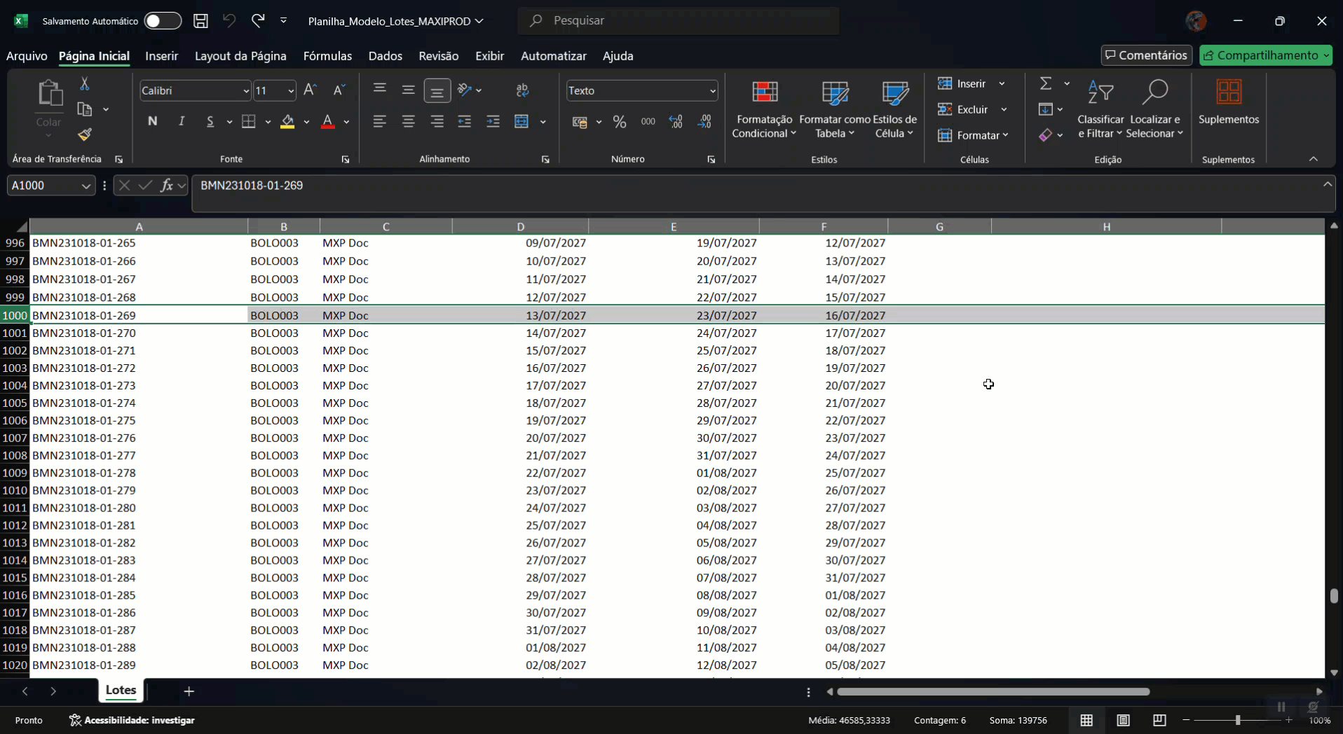 Exemplo na tela “Lotes”