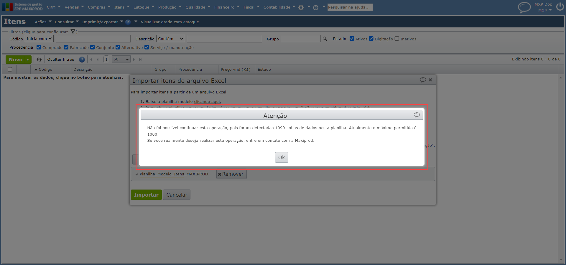 Na tela “Itens”, ao tentar importar mais que 1000 linhas, é mostrada a mensagem: