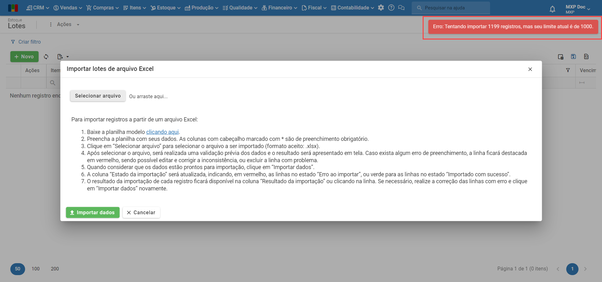 Erro: Tentando importar xxxx registros, mas o limite atual é 1000.
