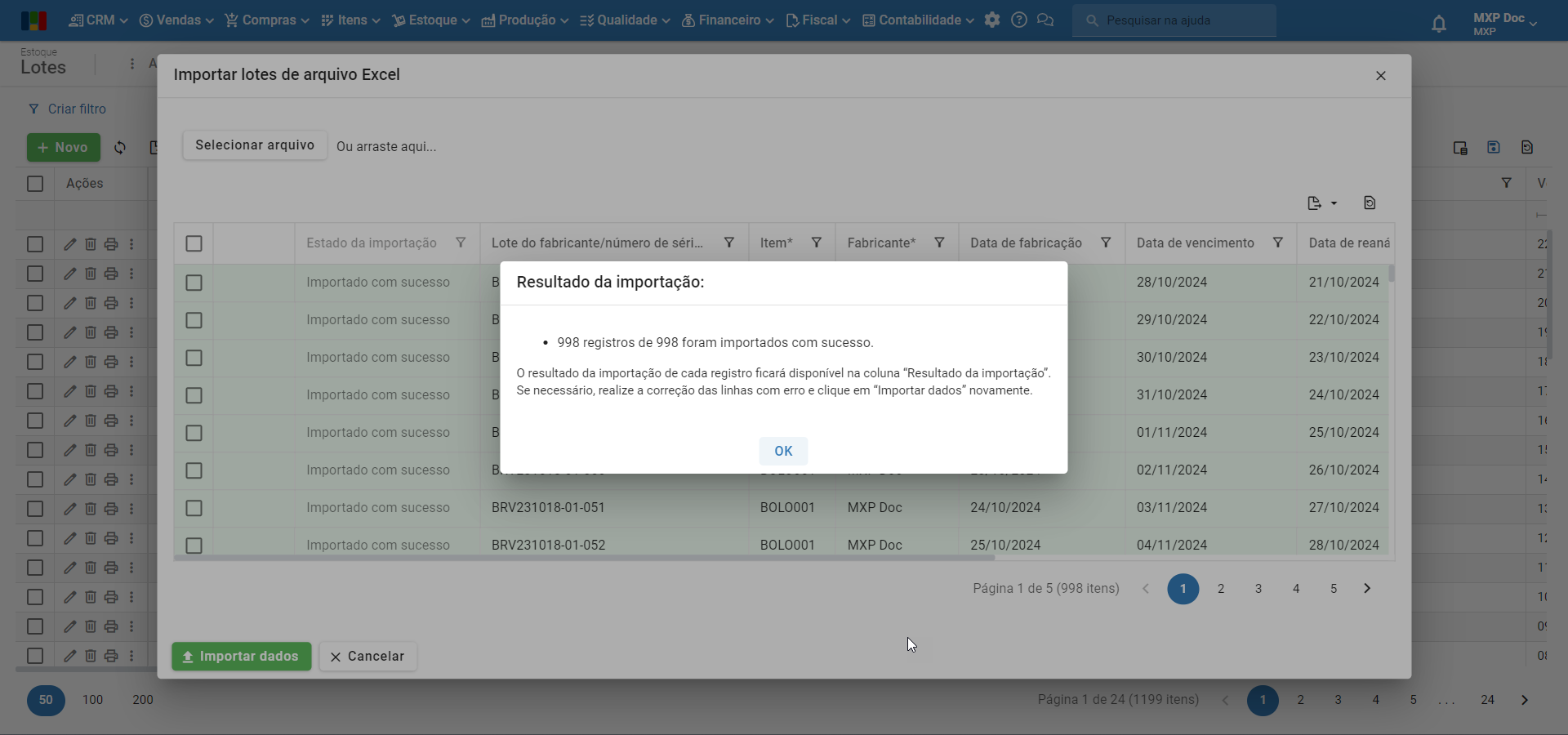 xxxx registros de xxxx foram importados com sucesso.