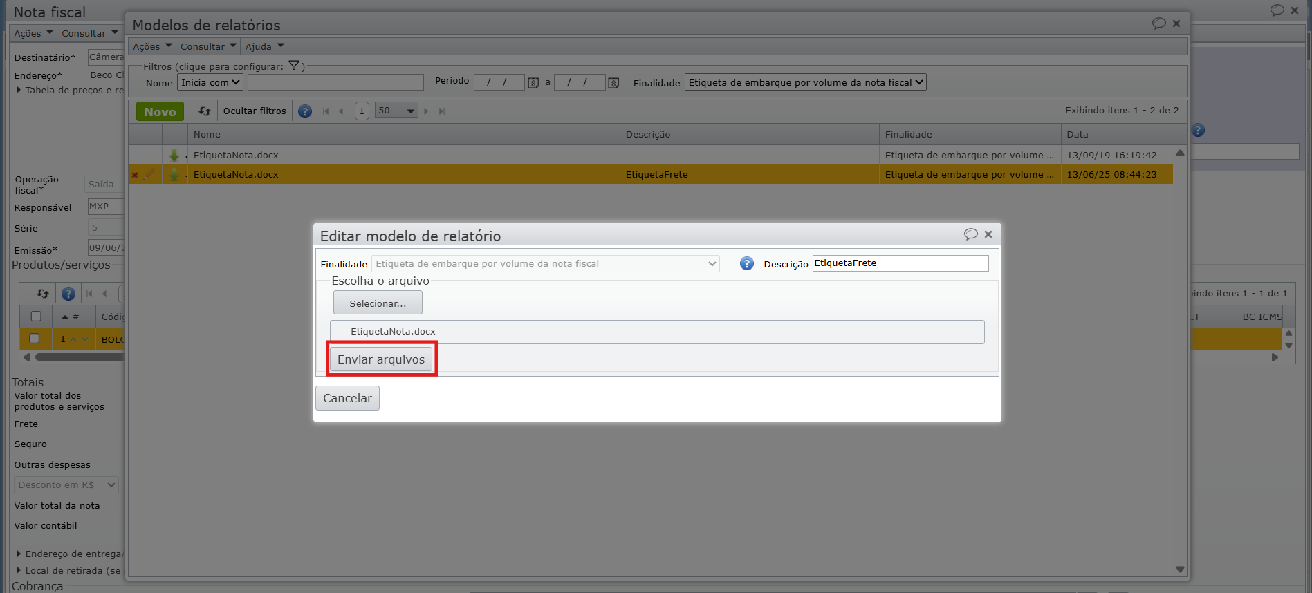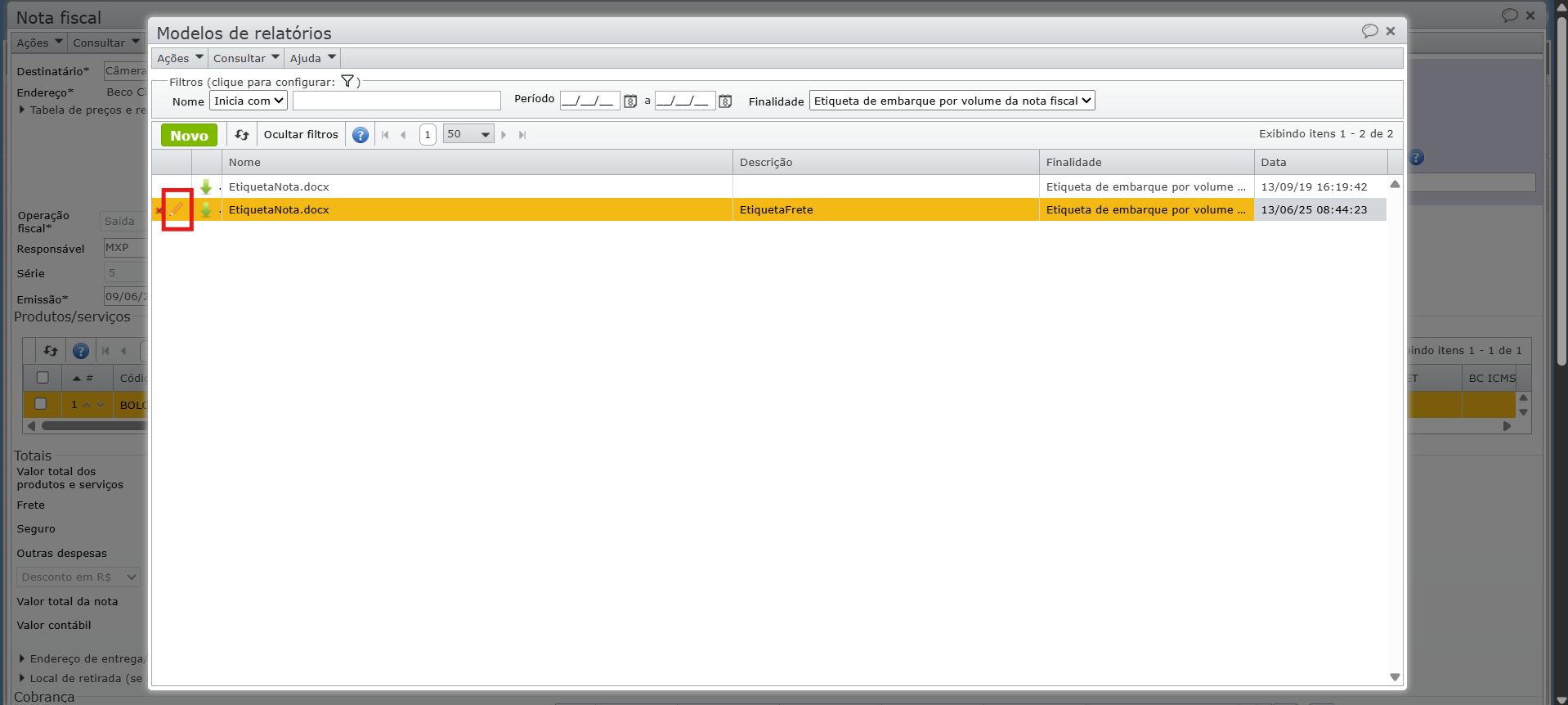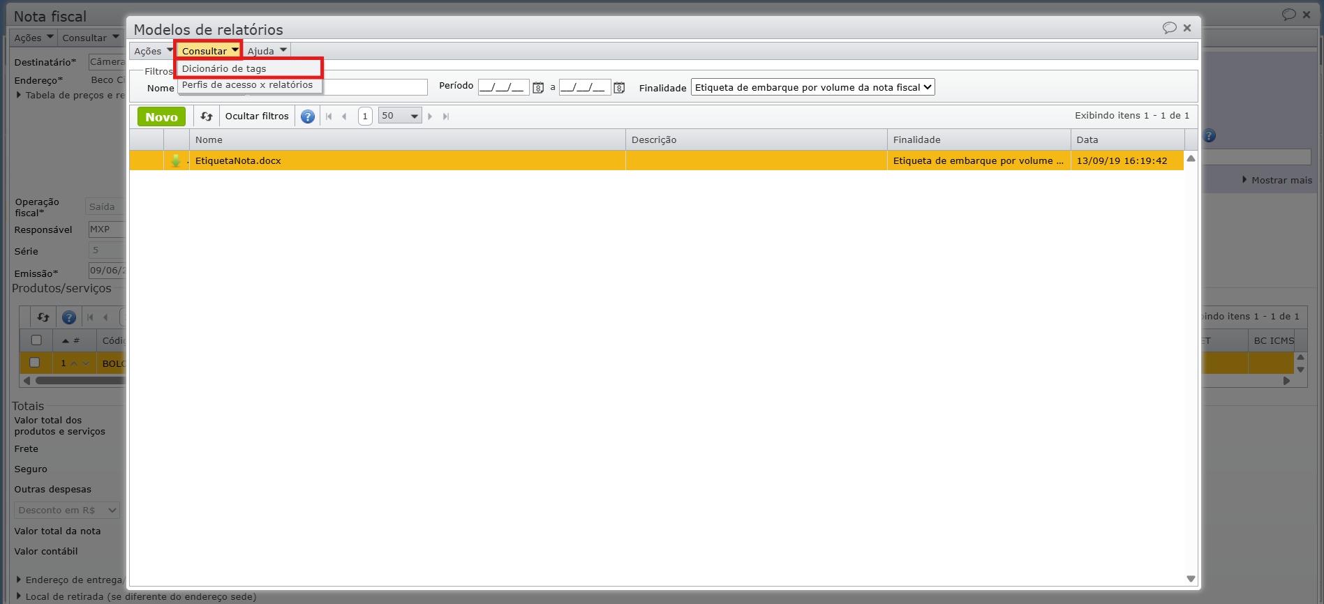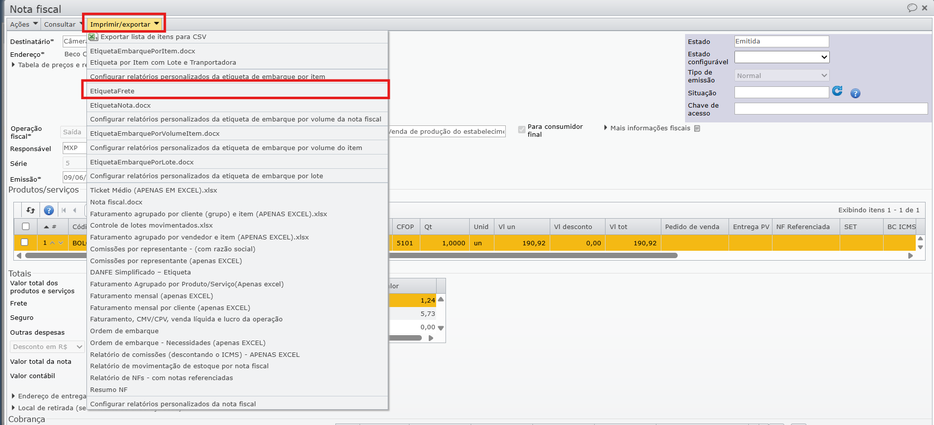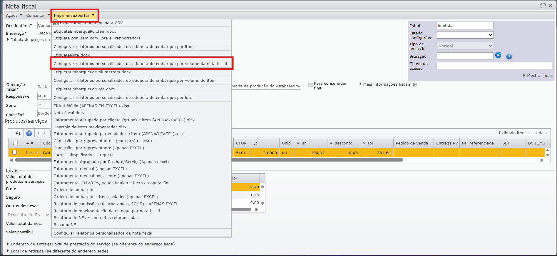 1) Clique no menu “Imprimir/exportar > Configurar relatórios personalizados da etiqueta de embarque por volume da nota fiscal”.