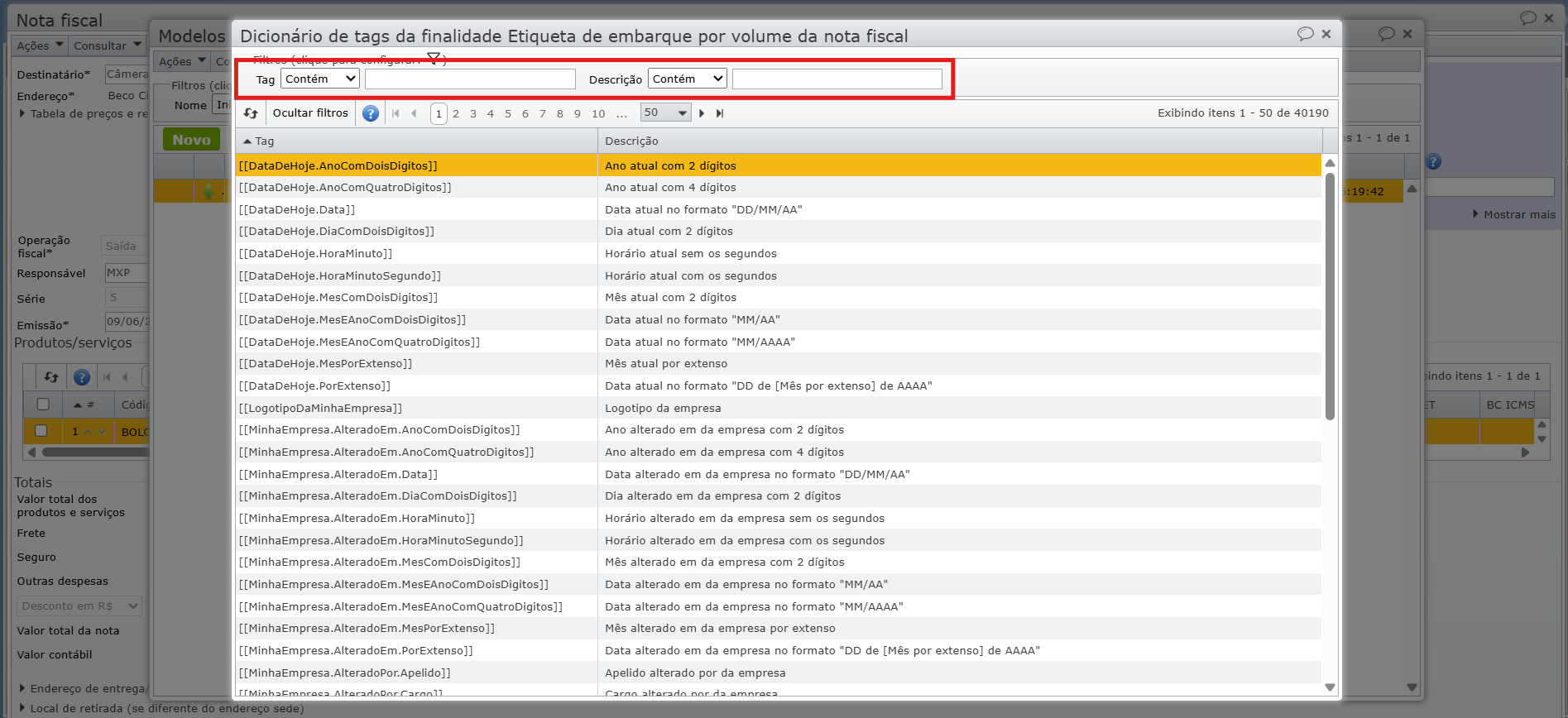 3) Serão listadas as tags da finalidade, neste exemplo, “etiqueta de embarque por volume da nota fiscal”. Utilize os filtros para encontrar a tag do campo desejado. A descrição indica a função da tag.