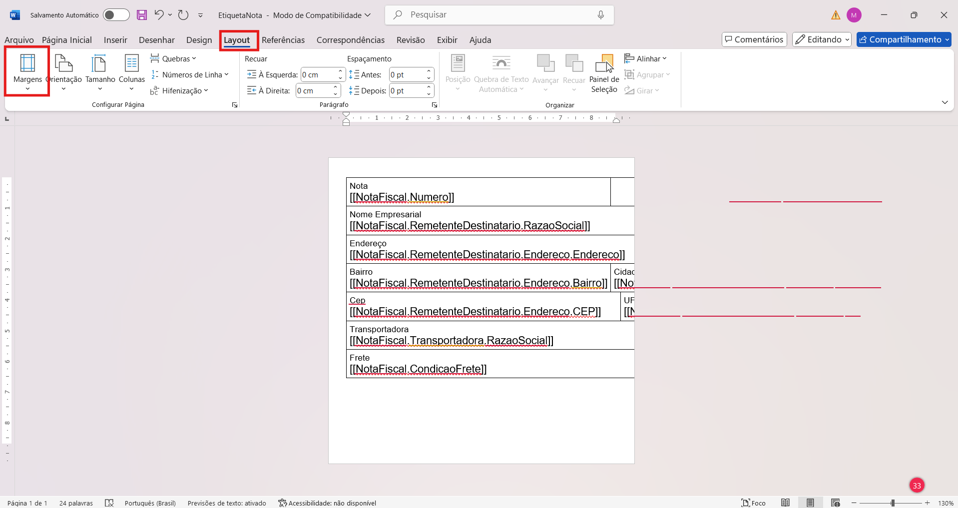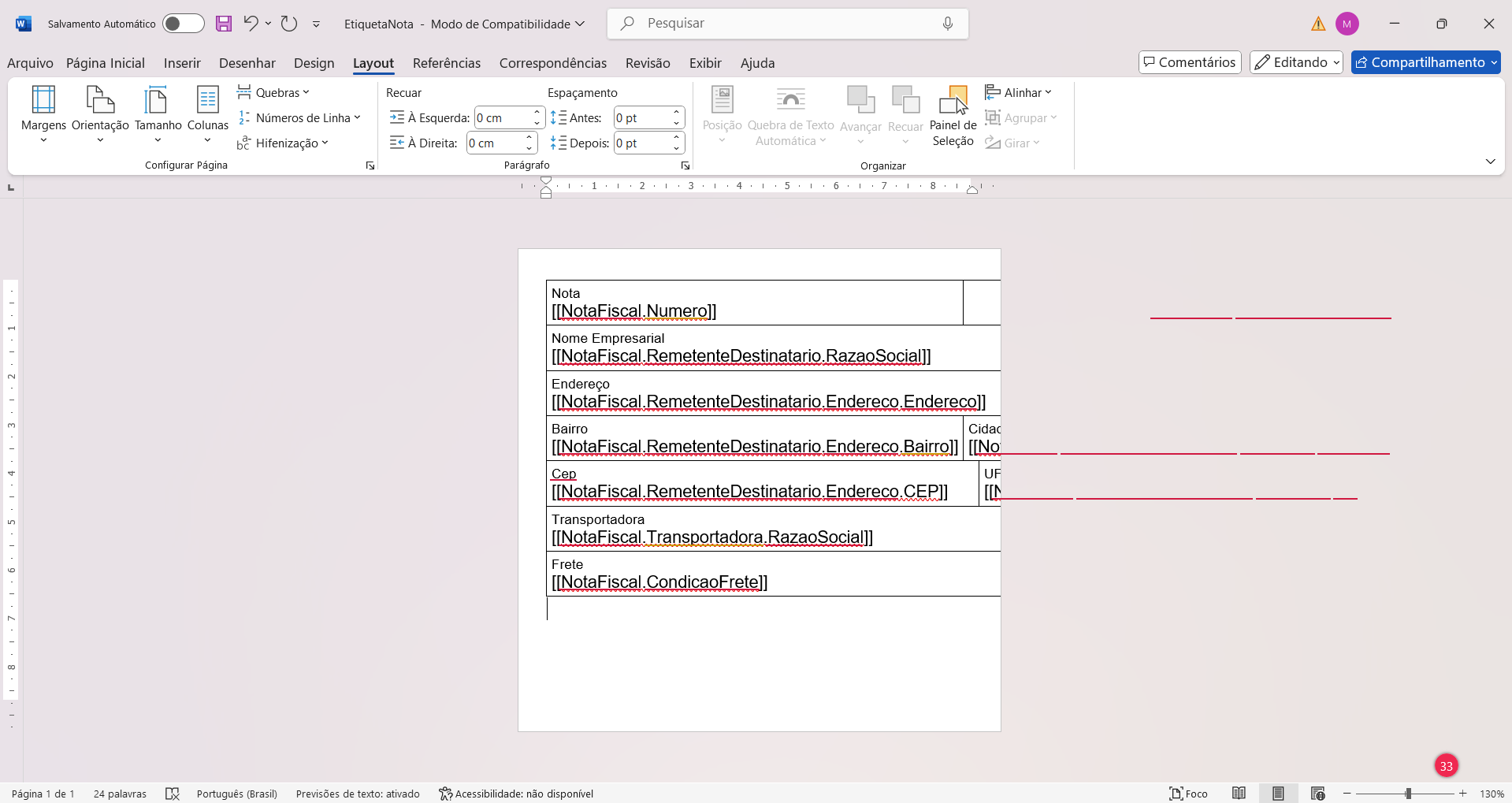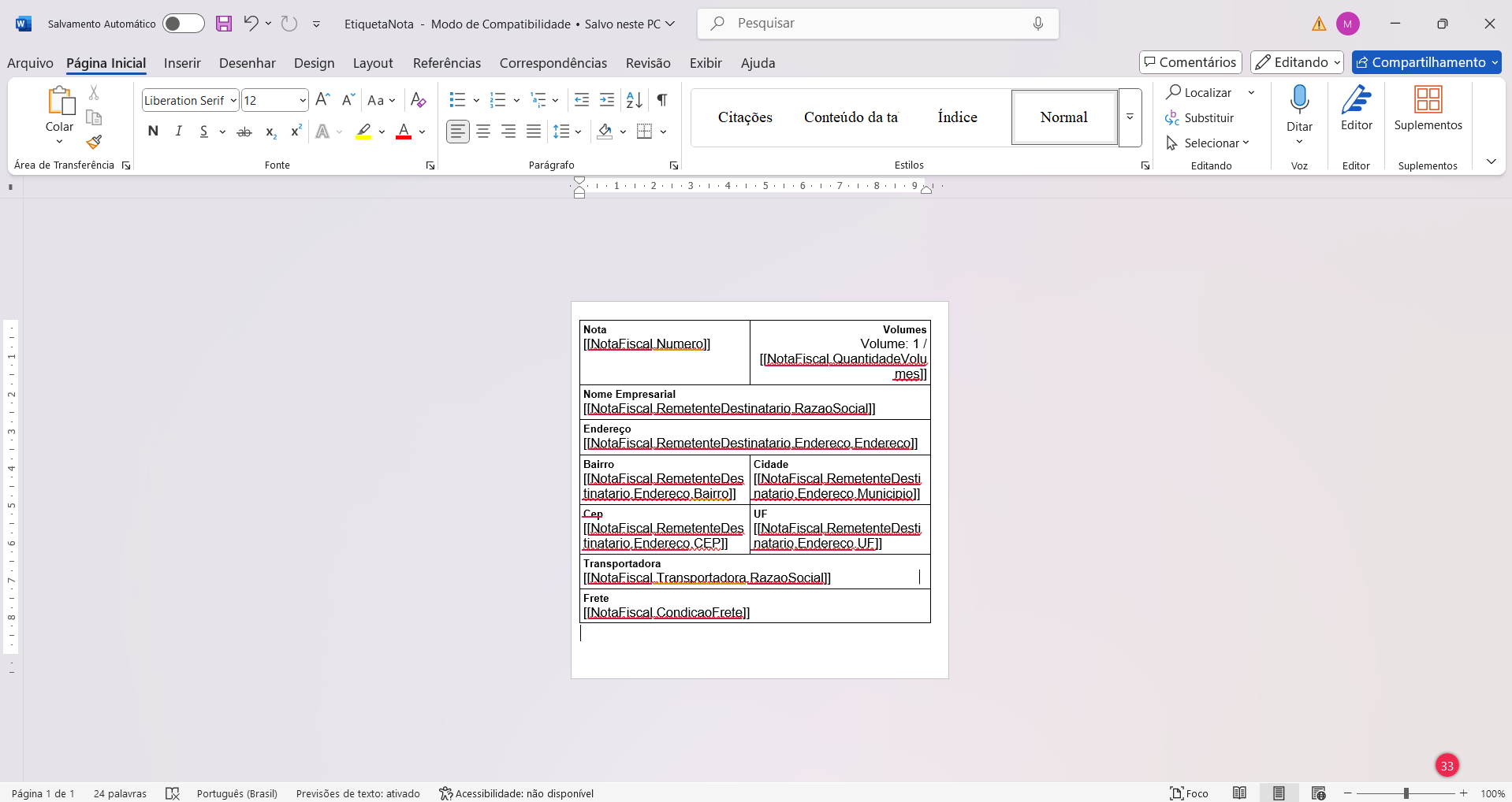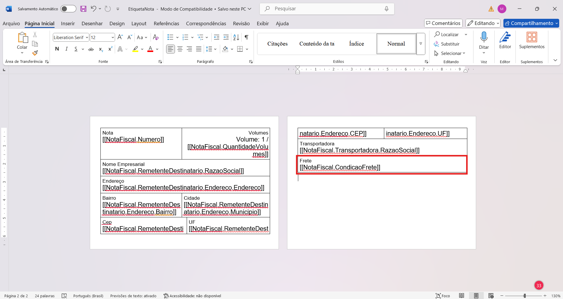 5) O arquivo em formato “Word” ou “Excel” será baixado para o seu computador, para serem feitas as alterações. Pode-se alterar o layout, adicionar ou retirar tags, etc. No exemplo abaixo, foi incluída a tag “[[NotaFiscal.CondicaoFrete]]”.