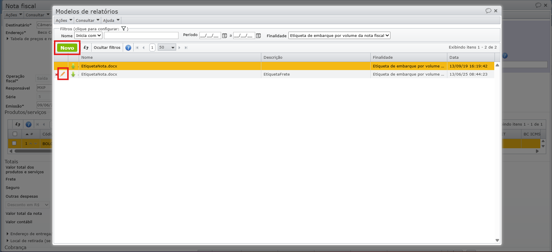 6) Salve as alterações feitas no arquivo e, ainda na tela “Modelos de relatórios”, clique no botão verde “Novo” para importar um novo relatório, ou clique no ícone “lápis” para atualizar um relatório personalizado existente.