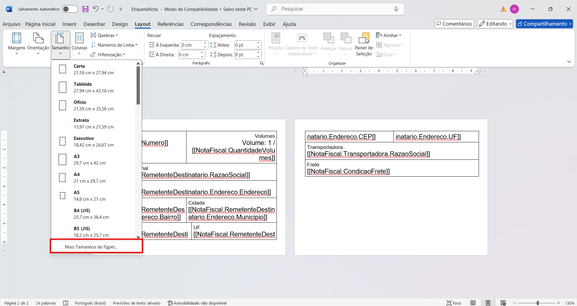 1) Para ajustar o tamanho, abra o arquivo Word, clique no menu superior “Layout” e, no campo “Configurar Página”, clique na opção “Tamanho”.