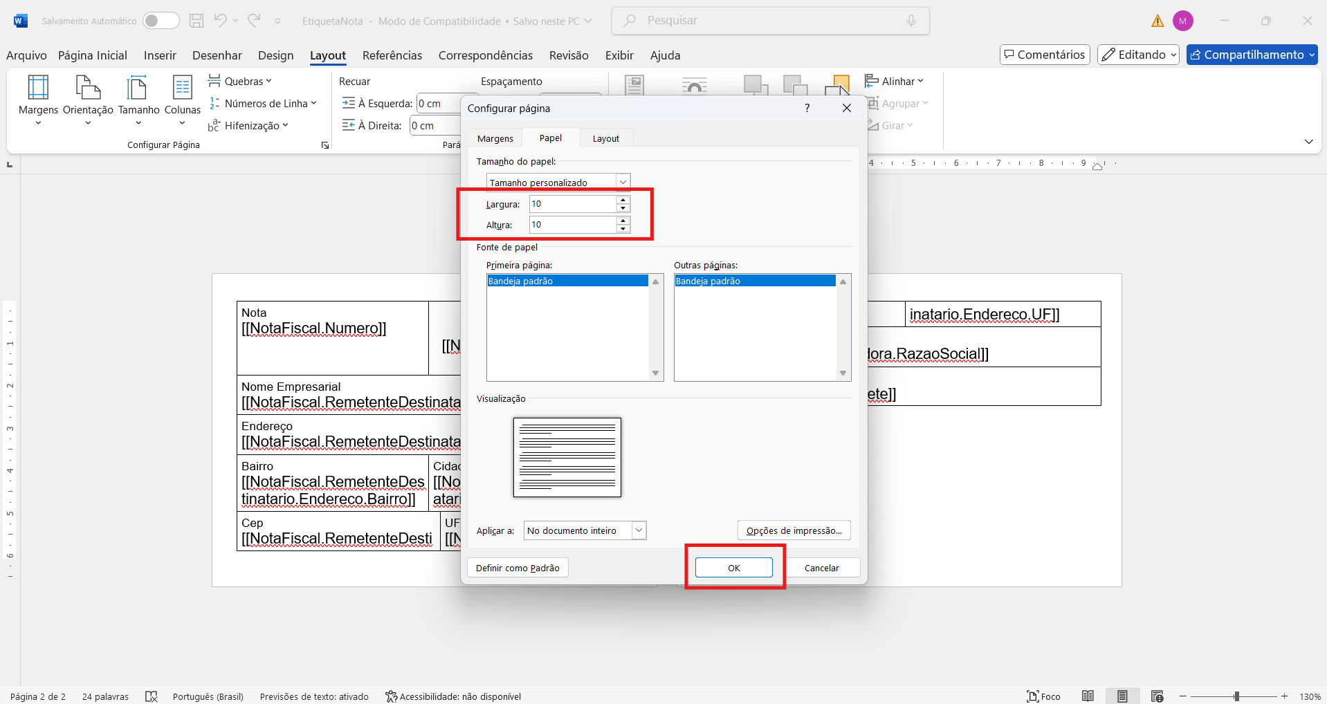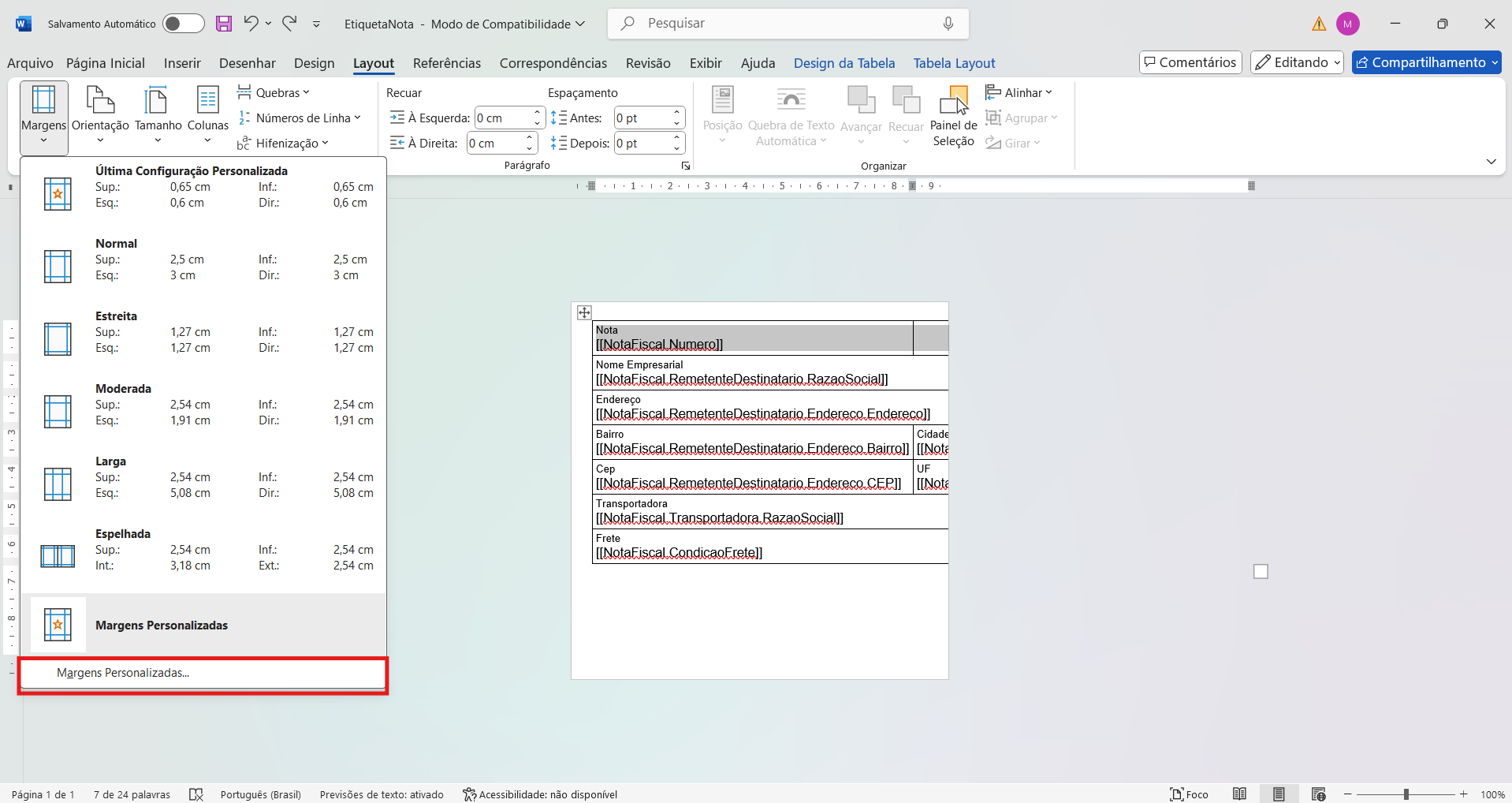 Ao imprimir etiquetas, o resultado pode não ficar bem alinhado ou no tamanho esperado, sendo necessário ajustar o tamanho do modelo de impressão ou as margens para a impressão ficar compatível com o layout do papel e a impressora utilizada. Para editar: