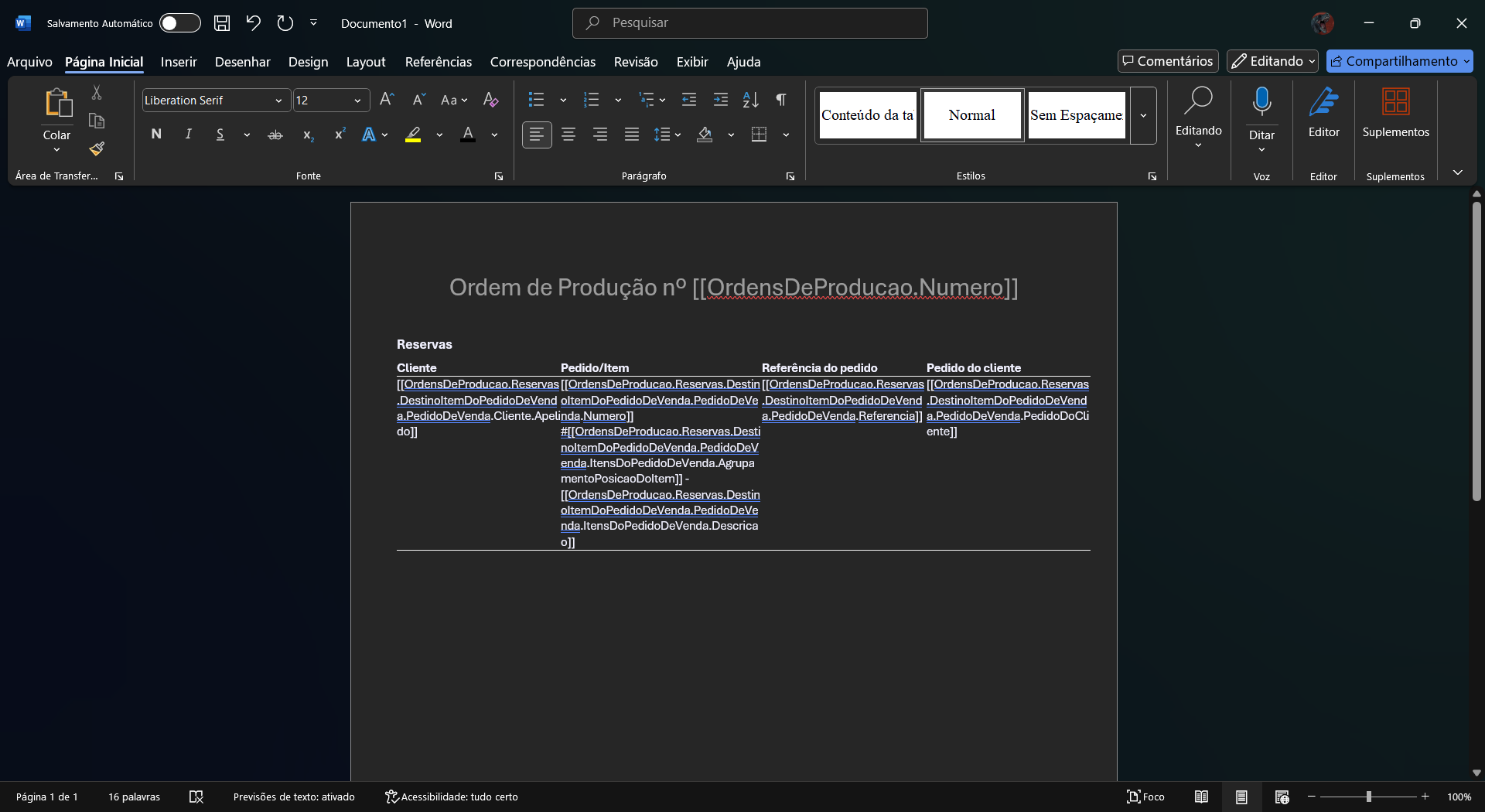 2) Cole as tags dos campos que deseja incluir no modelo e salve-o. O relatório respeitará a formatação informada no documento (tamanho da fonte, disposição dos dados, etc).