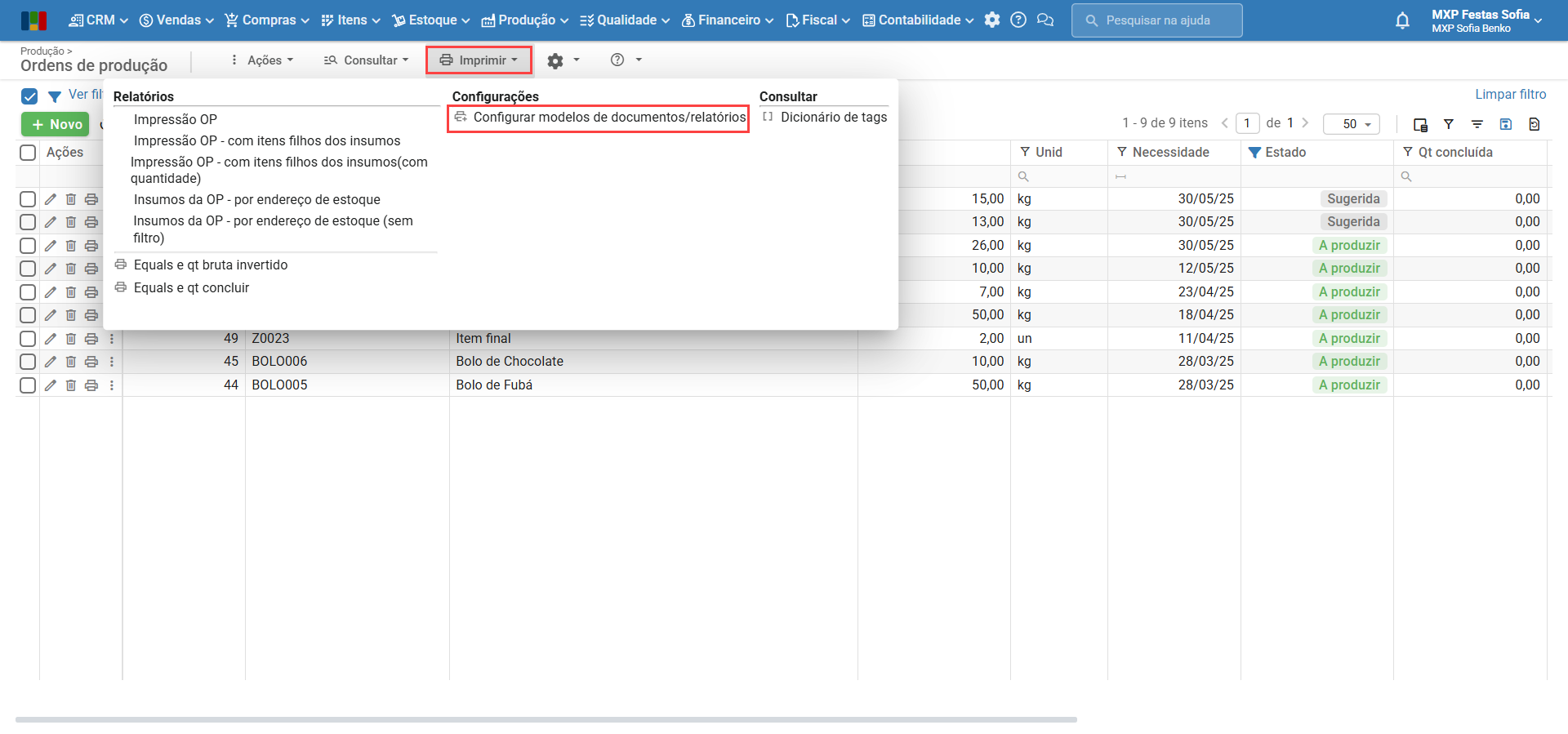 1) Acesse o menu “Imprimir > Configurar modelos de documentos/relatórios”.