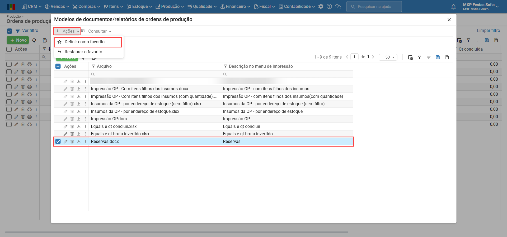 Caso nenhum relatório seja informado como favorito, é usado o modelo padrão do ERP MAXIPROD. Abaixo, é mostrado o passo-a-passo de como tornar um modelo o favorito.