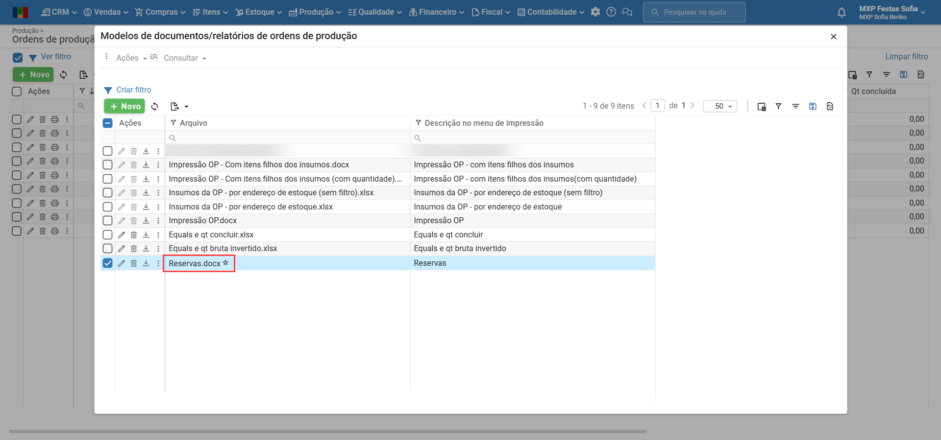 Os relatórios são agrupados por finalidade, por exemplo: nota fiscal, ordem de produção, contas a receber, etc. Para cada finalidade, podem existir vários modelos de relatórios, em formato .xlsx (Excel) ou .doc/.docx (Word). Os modelos padrão são fornecidos pelo ERP MAXIPROD e não podem ser alterados pelos assinantes, mas cada assinante pode criar seus próprios relatórios personalizados, a partir de um modelo padrão.