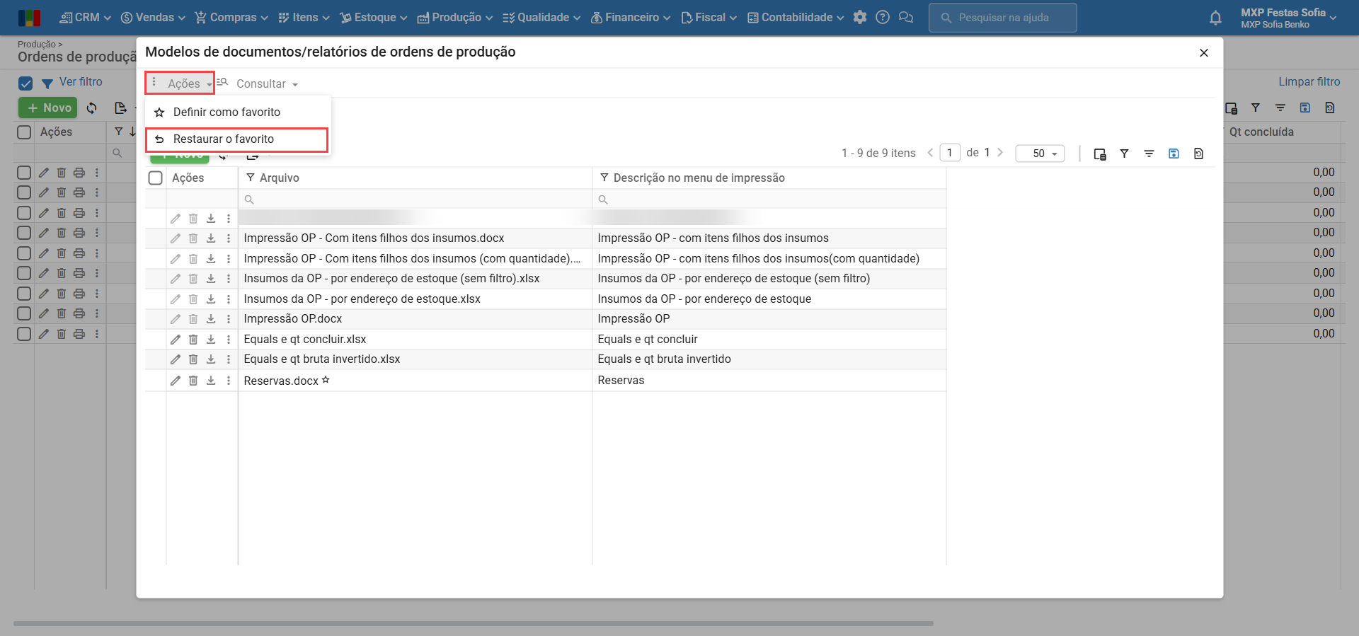Tornar um relatório favorito é como torná-lo padrão para a sua empresa, para aquela finalidade. Assim, quando clicar no ícone de “impressora”, ou pedir a impressão dentro de um cadastro (por exemplo, de ordens de produção), o relatório usado será aquele que foi tornado favorito.