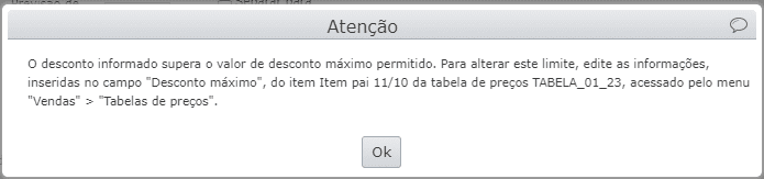 - Desconto máximo (%): este campo cria um teto para o desconto informado. Ou seja, independente da quantidade ou do representante informado no registro de venda, se este campo estiver preenchido não será possível salvar o item do campo “Item” com um desconto acima desse percentual, sendo exibido um bloqueio caso tentar: