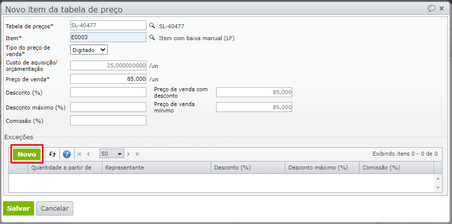 2) Na tela de edição do item da tabela, clique em “Novo” para cadastrar uma nova exceção: