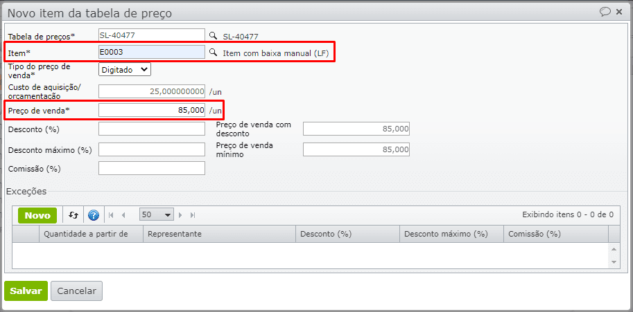 1) Crie uma tabela de preços, inserindo o primeiro item. Neste exemplo, o item utilizado foi o E0003 com um preço de venda padrão de R$85,00: