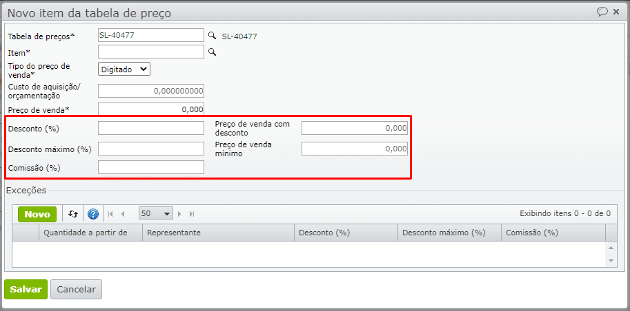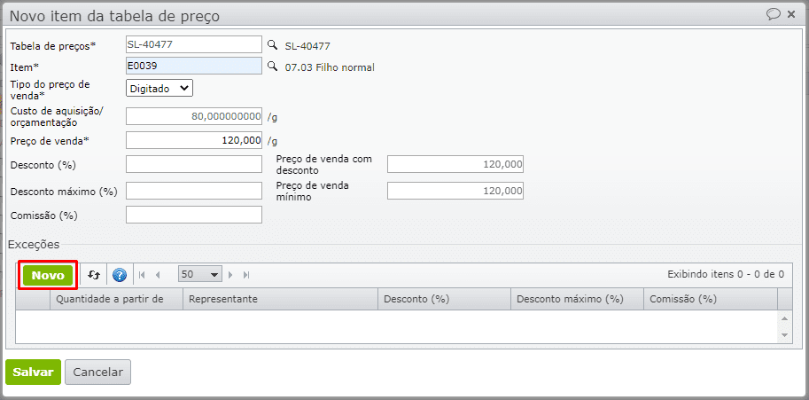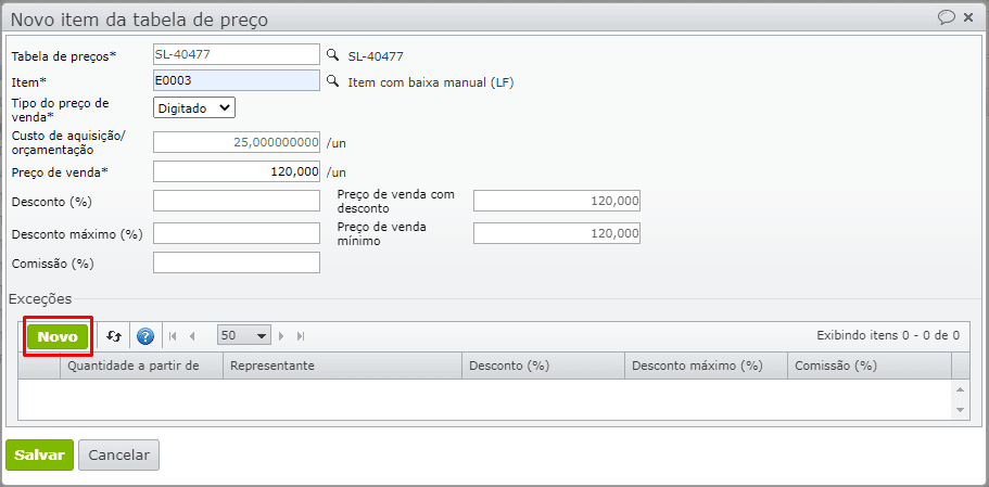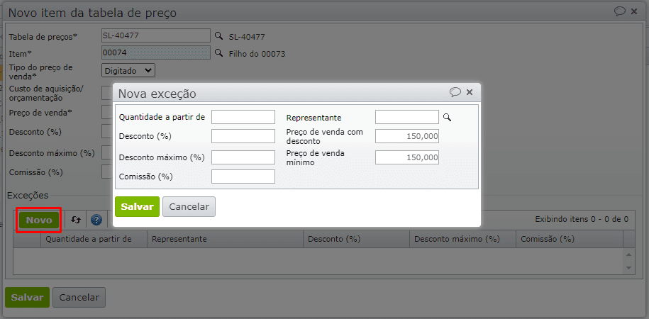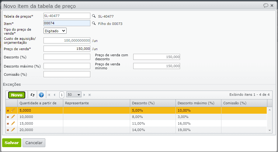 3) Para informar descontos em função da quantidade, é necessário inserir uma ou mais exceções através do botão “Novo”.