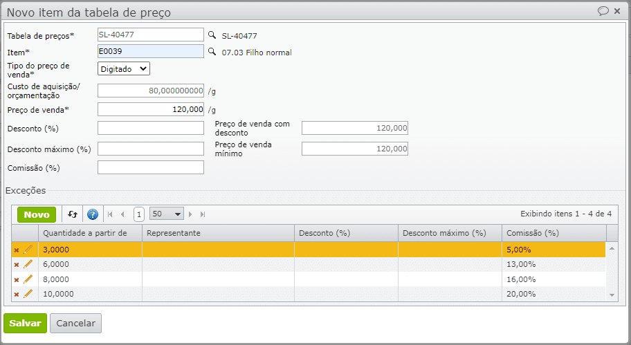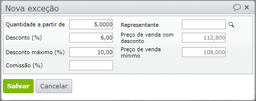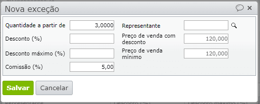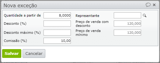 5) Para que diferentes representantes/vendedores recebam comissões diferentes ou possam dar diferentes descontos, cadastre exceções para cada quantidade e representante.