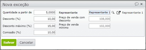 Por exemplo, se o representante X pode dar um desconto de 10%, mas o representante Y apenas pode dar um desconto de 5%, devem ser cadastradas exceções que calculem automaticamente os descontos e comissões conforme o representante informado: