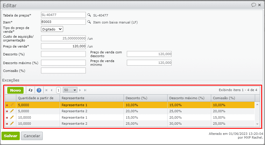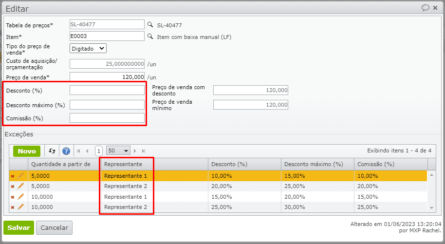5.1) Pelas exceções de comissão/desconto por representante/quantidade, cadastradas em “Vendas > Tabelas de preços” > grade de exceções, se alguma se aplicar.