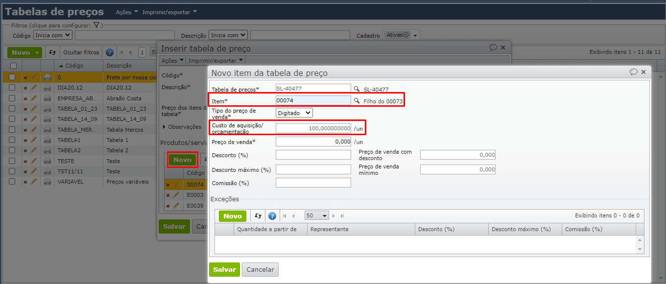 1) Crie uma tabela de preços inserindo o primeiro item. Neste exemplo, o item é o 00074, com preço de venda padrão de R$100,00: