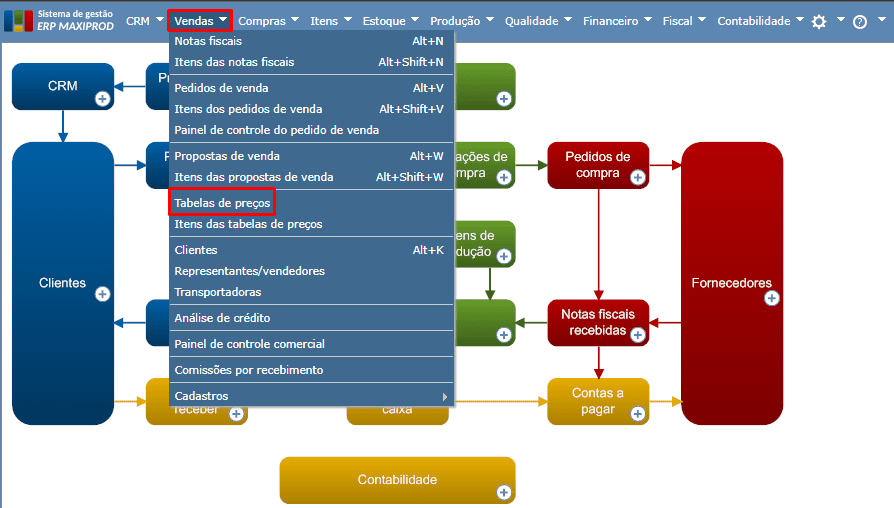 1) Acesse o menu “Vendas > Tabelas de preços”.