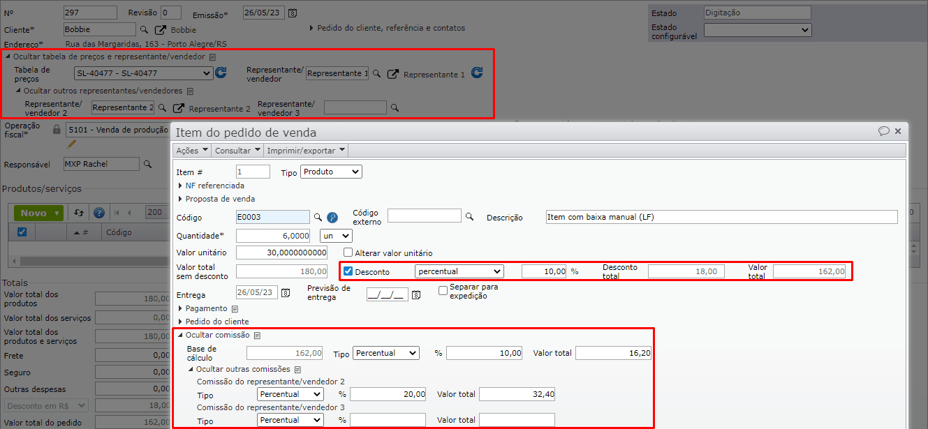 - Se forem vendidas 6 unidades do item E0003 e, no pedido de venda, forem informados dois representantes, o “Representante 1” e o “Representante 2”, por exemplo, o sistema fará uma verificação e, como há exceções que encaixam com esta quantidade e com ambos os representantes, inicializará o desconto e comissão, conforme o representante: