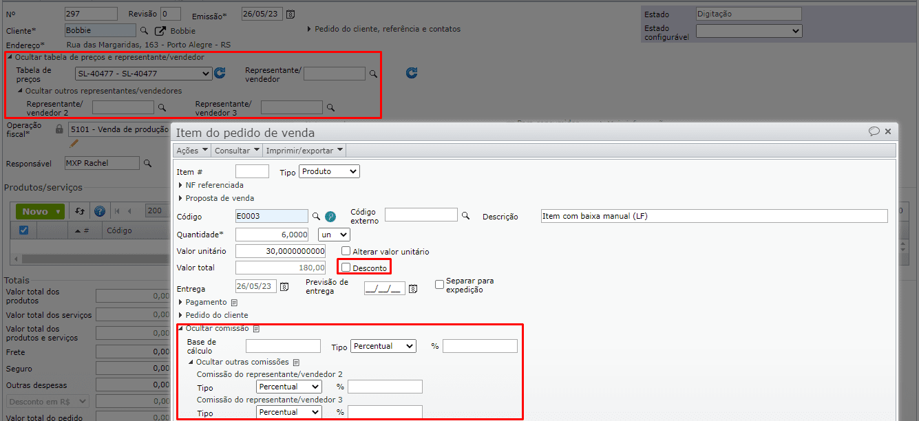 5) Com isso, ao inserir o item E0003 em propostas de venda, pedidos de venda ou notas fiscais, as exceções são aplicadas conforme o representante/vendedor no registro: