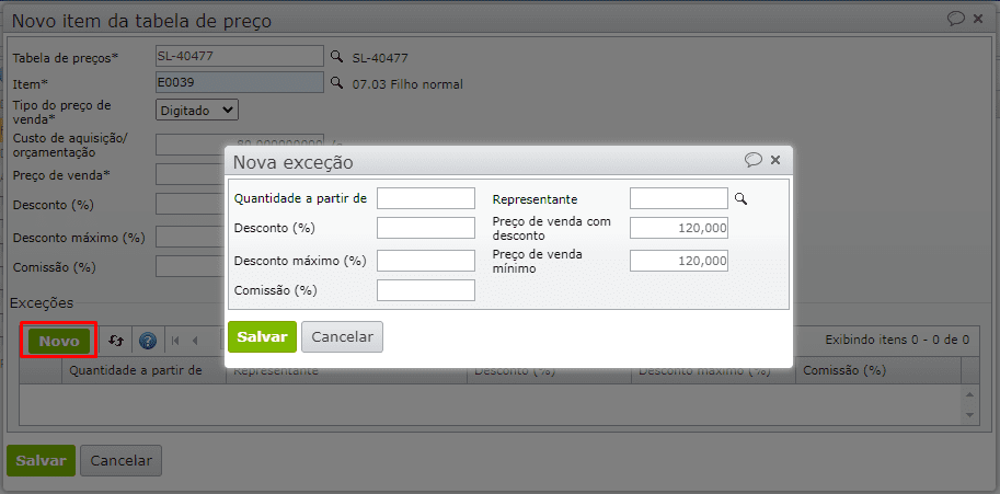 3) Para informar descontos em função da quantidade, é necessário inserir uma ou mais exceções através do botão “Novo”.