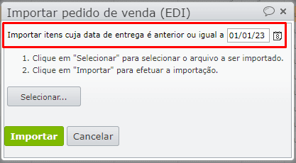 3) É aberta a tela mostrada a seguir. Clique em “Selecionar” e busque o arquivo EDI desejado. Para o sistema importar somente registros com entrega anterior ou igual à determinada data, preencha a opção “Importar itens cuja data de entrega é anterior ou igual a”. No exemplo abaixo, somente itens cuja data de entrega é anterior ou igual à 01/01/23 serão considerados ao importar um arquivo: