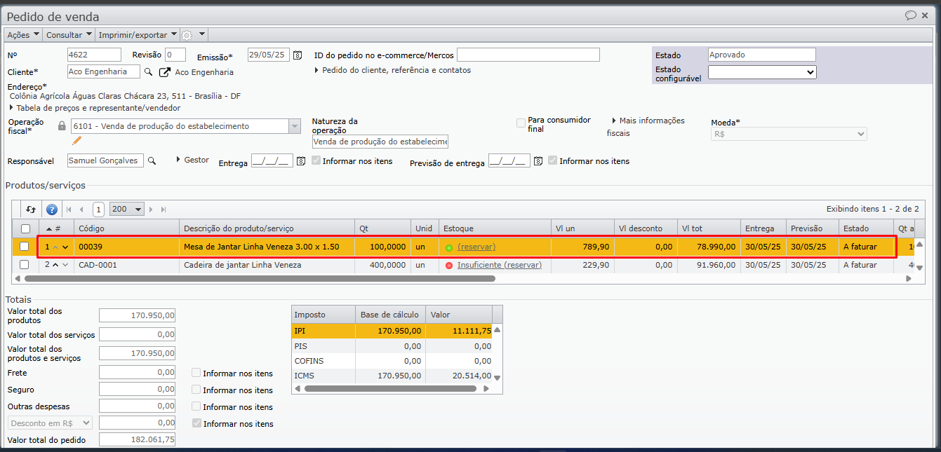 4) Em um segundo momento, ao produzir as 400 cadeiras, estas devem ser faturadas com uma nova nota fiscal, ainda vinculada ao mesmo pedido, que será concluído.