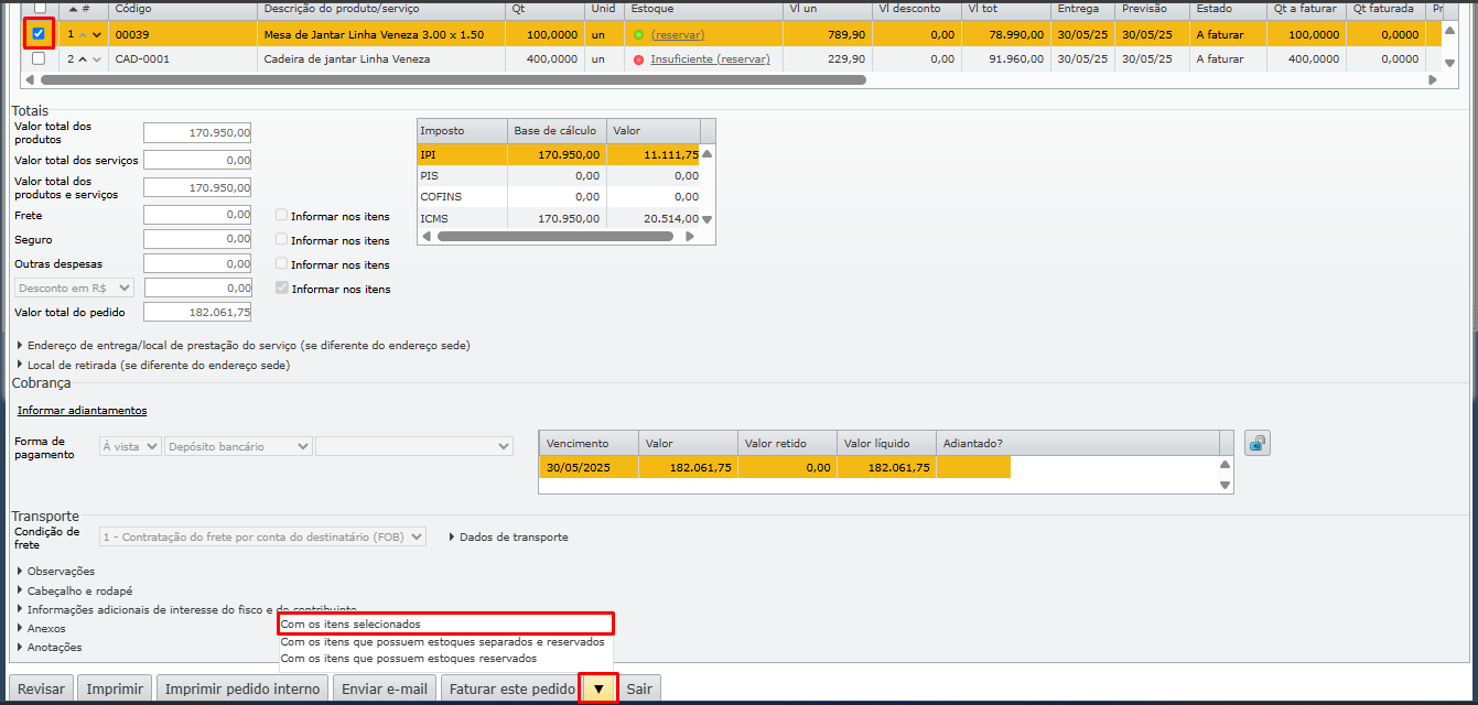 2) Marque o(s) item(ns) a faturar por meio da caixa de seleção, navegue até o rodapé da tela de edição e clique na seta localizada no botão “Faturar este pedido” e utilize a opção “Com os itens selecionados”.
