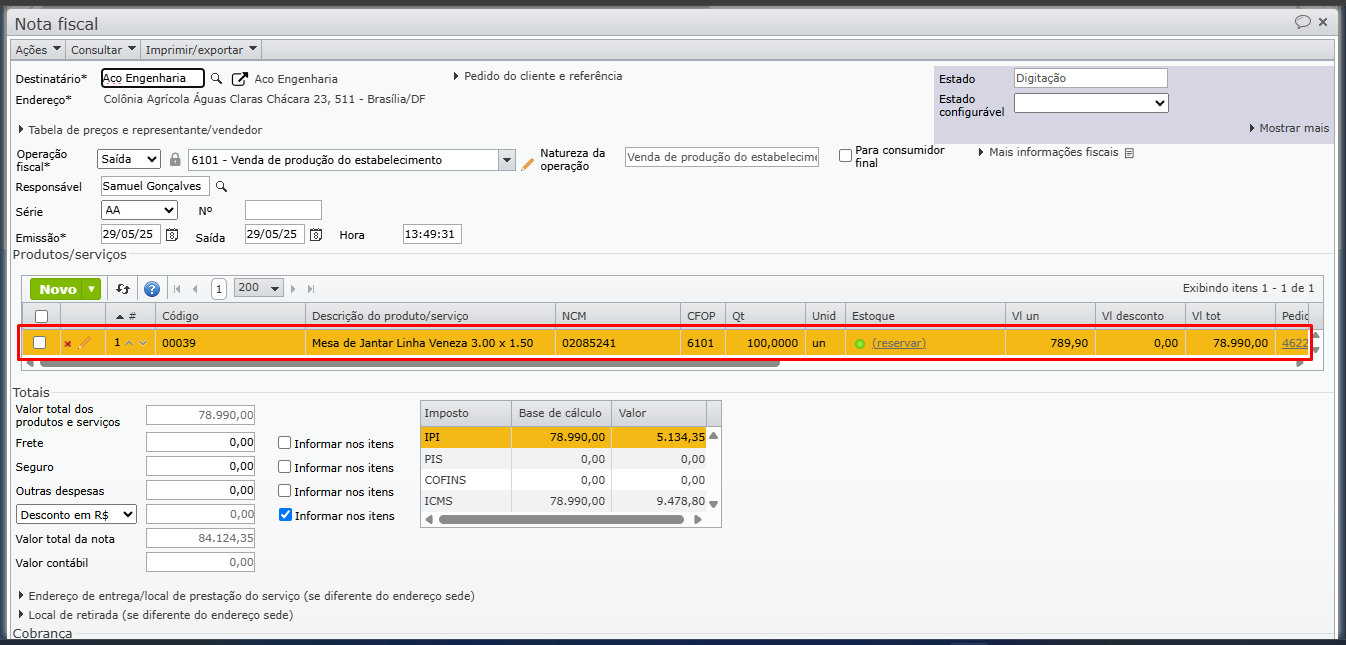 3) É gerada uma NF-e similar ao pedido de venda, somente com o(s) item(ns) selecionado(s).