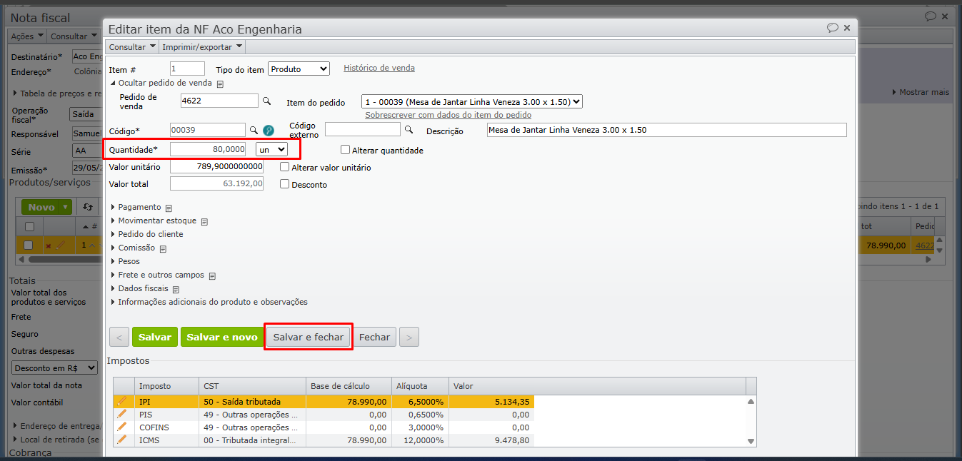 4) É possível emitir a NF-e com quantidade do item inferior à quantidade do pedido, ou seja, faturamento parcial também em relação à quantidade do item. Para isso, clique no “ícone do lápis” para abrir a tela de edição do item da nota, altere para a quantidade desejada, e clique em “Salvar e fechar”.