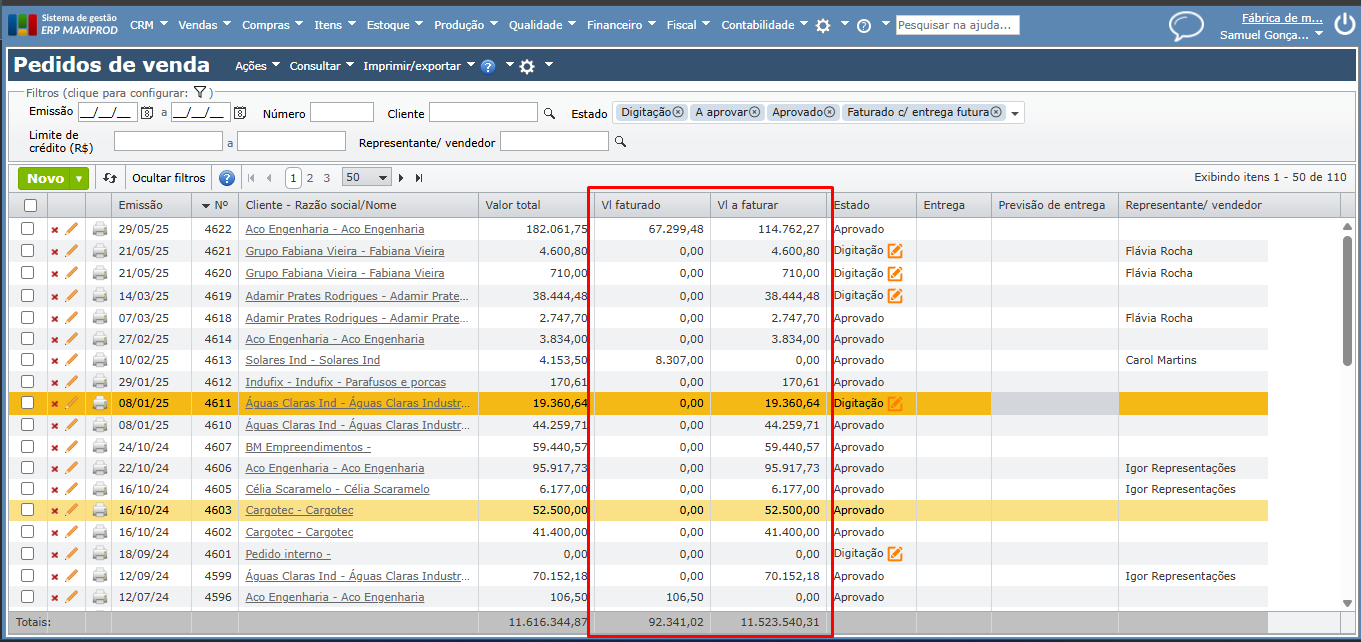 6) Pode-se acompanhar os valores faturado e a faturar pela grade de pedidos de venda (“Vendas > Pedidos de venda”), onde há colunas que exibem estes valores.