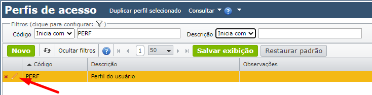 2) Encontre o perfil de acesso que deseja editar e abra sua edição através do ícone do lápis ou duplo clicando sobre o registro: