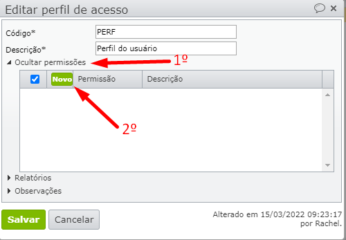 3) Expanda a seção “Permissões” e clique em NOVO para inserir novas permissões no perfil: