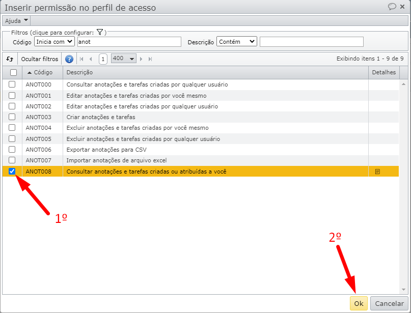 4) Encontre a permissão “ANOT008 – Consultar anotações e tarefas criadas ou atribuídas a você”, selecione-a e clique em OK: