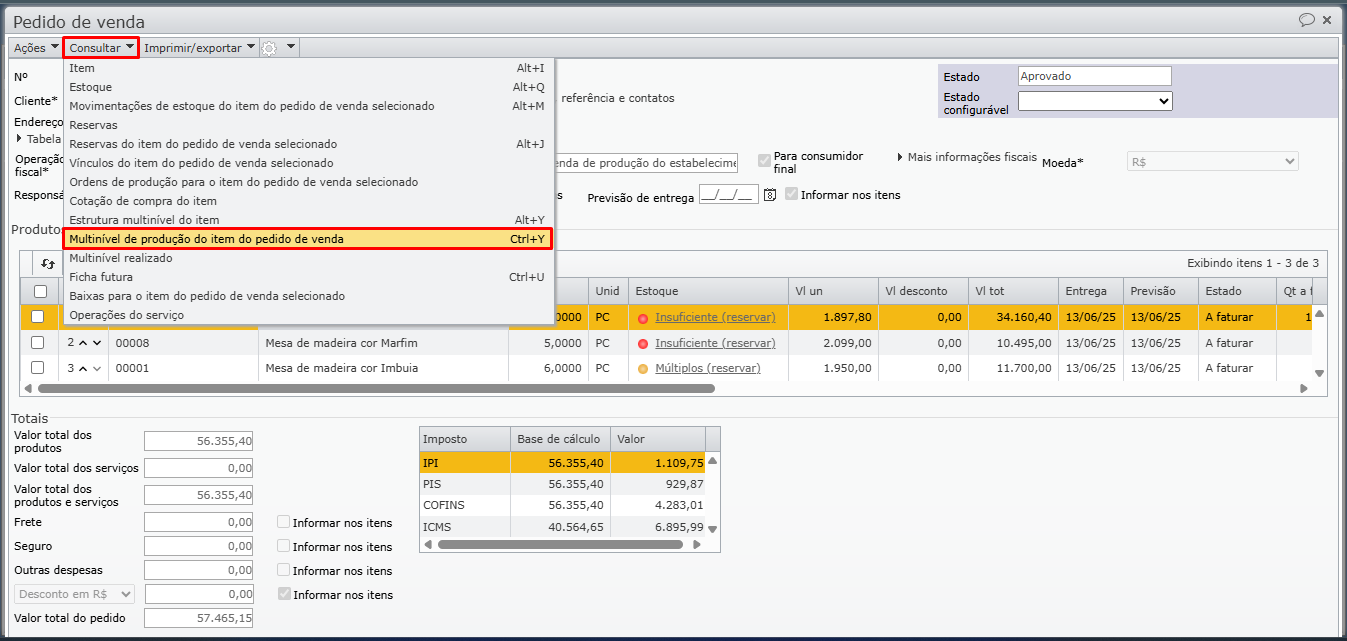 3) Na tela de edição do pedido de venda, clique sobre a linha do item cujo multinível de produção deseja consultar, deixando a linha alaranjada. A seguir, vá para “Consultar > Multinível de produção do item do pedido de venda” ou utilize o atalho “Ctrl+Y”.